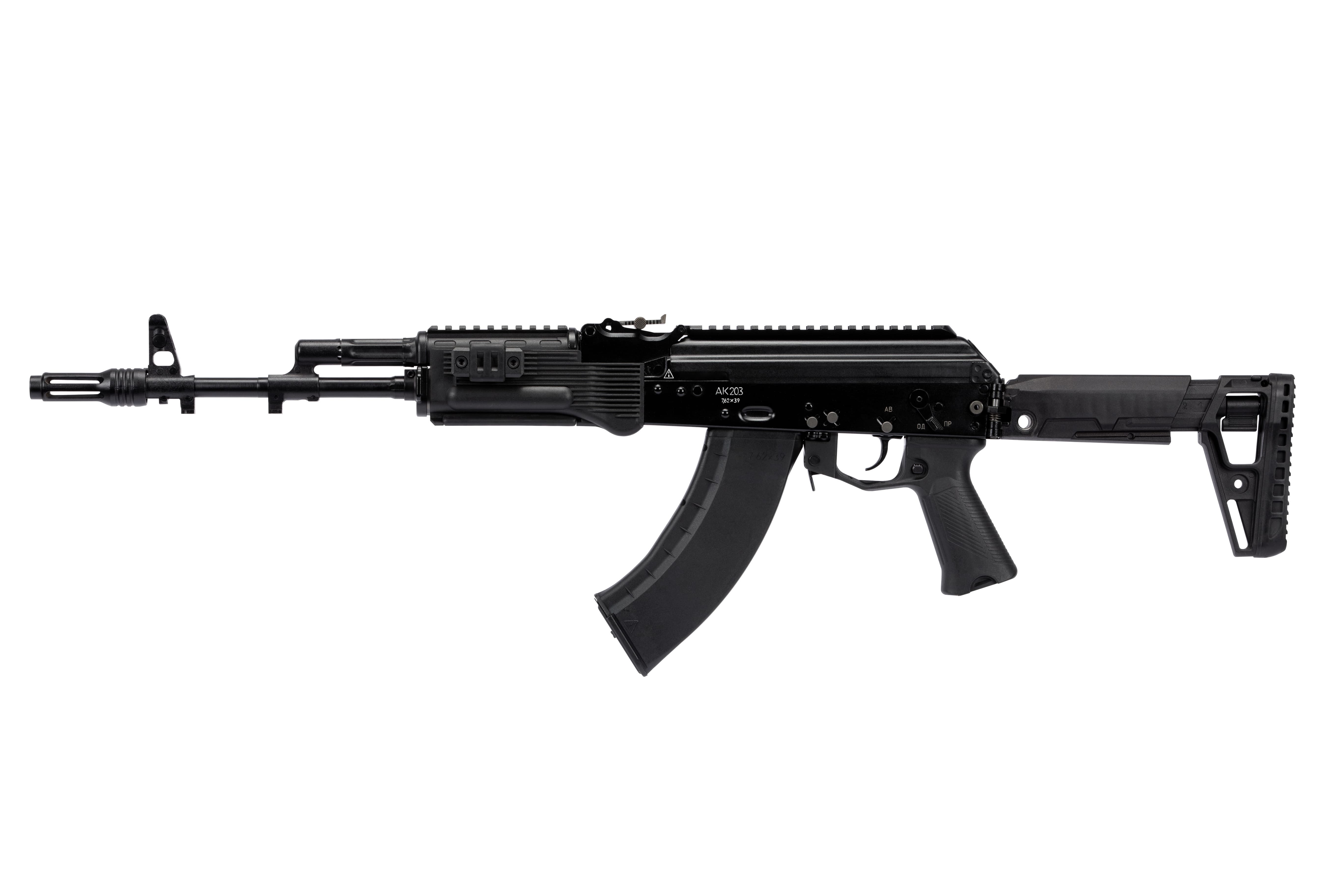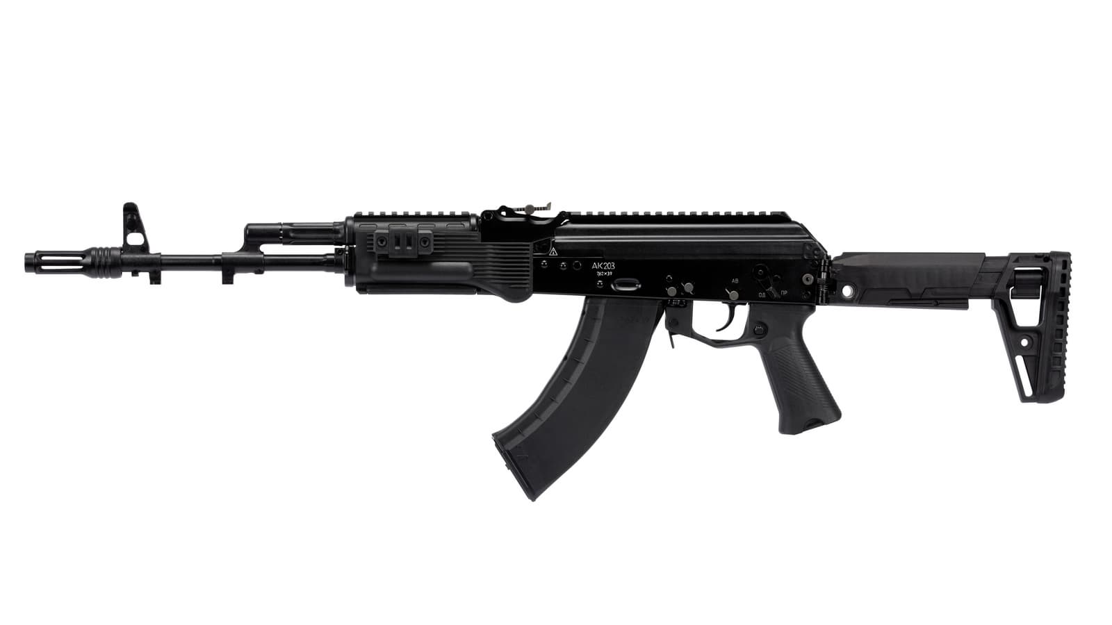 АК-203 — это модификация АК-200 под патрон калибра 7,62 на 39 мм. В 2023 году на совместном предприятии Indo-Russian Rifles Private Limited стартовало производство АК в Индии. АК «двухсотой серии» оснащают пистолетной рукояткой, универсальными планками для крепления аксессуаров и регулируемым прикладом.