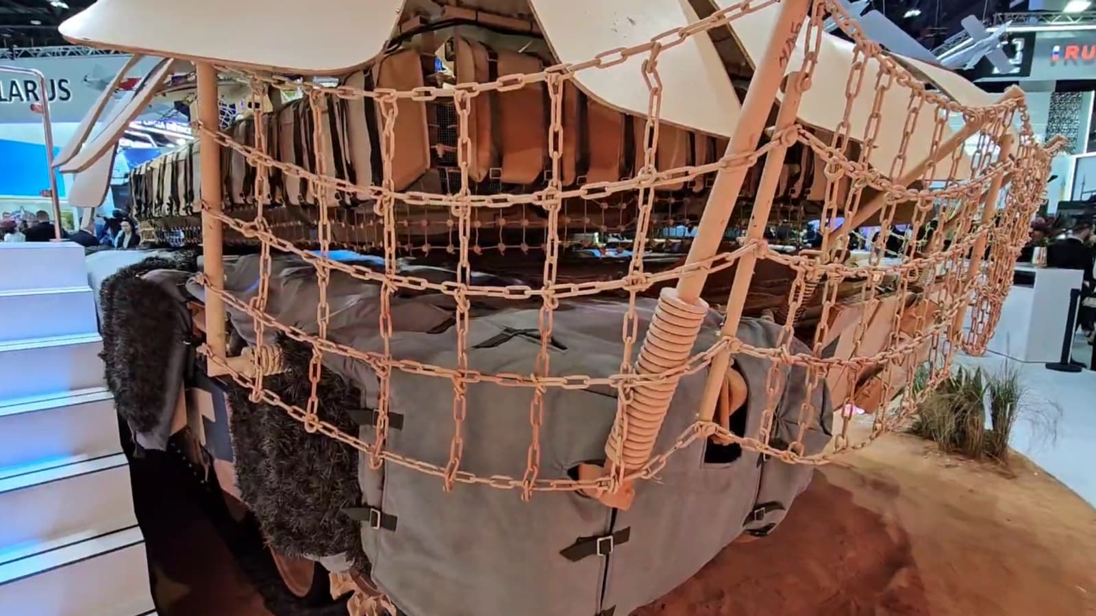 Модернизированный на основе реального боевого опыта танк Т-90МС, который показали на выставке IDEX 2025 в Абу-Даби, получил дополнительную защиту кормы из цепей.