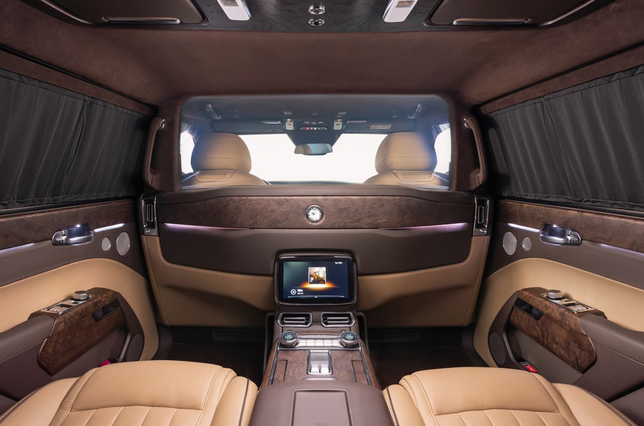 Удлиненный Aurus Komendant на 500 мм длиннее стандартного. Сзади у пассажиров больше свободного пространства для ног, а в салоне установили поднимающуюся перегородку, как в лимузинах.