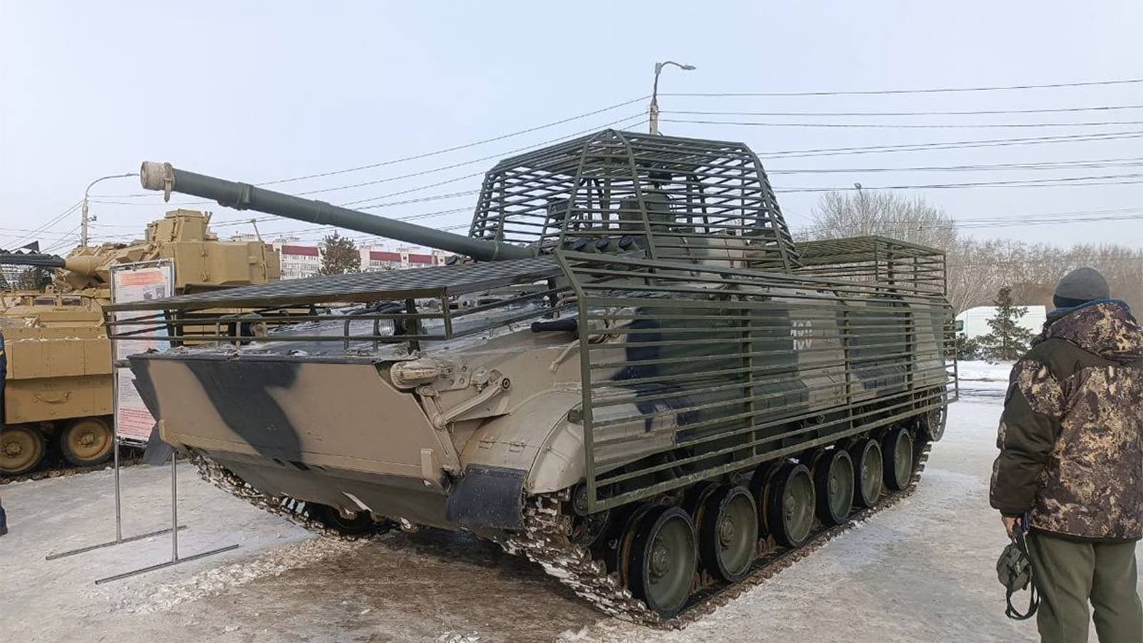 В Сети появились кадры с боевой машиной пехоты БМП-3 оснащенной уже ставшим привычным антидроновым экраном.