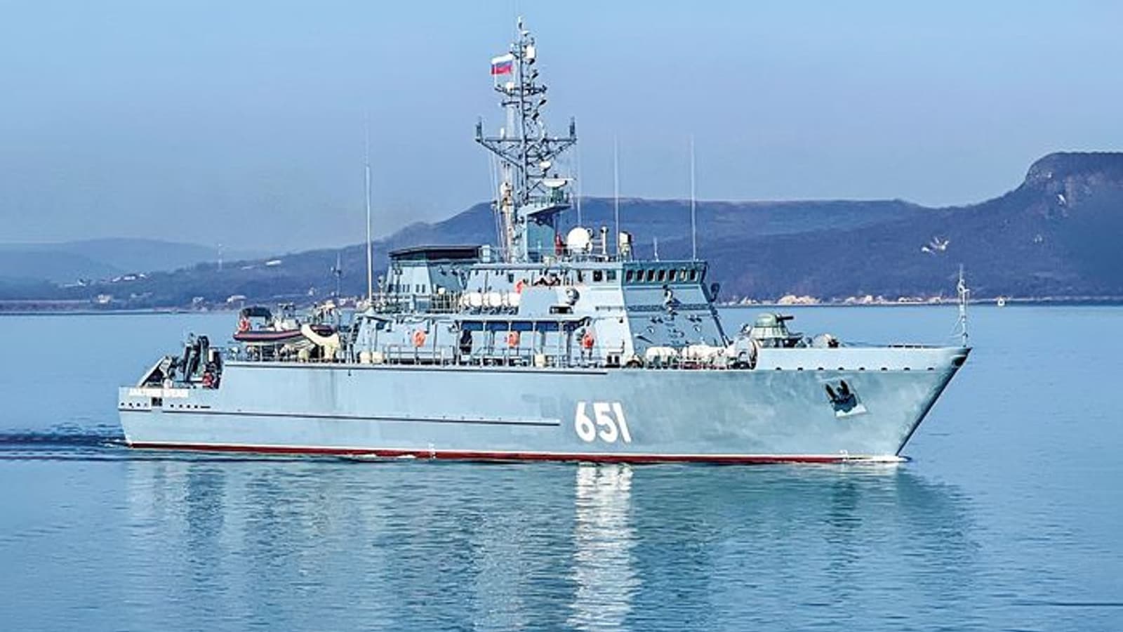 На морском полигоне тральщик отработал задачи по уничтожению скоростных надводных целей, имитирующих безэкипажные катера (БЭК) противника.