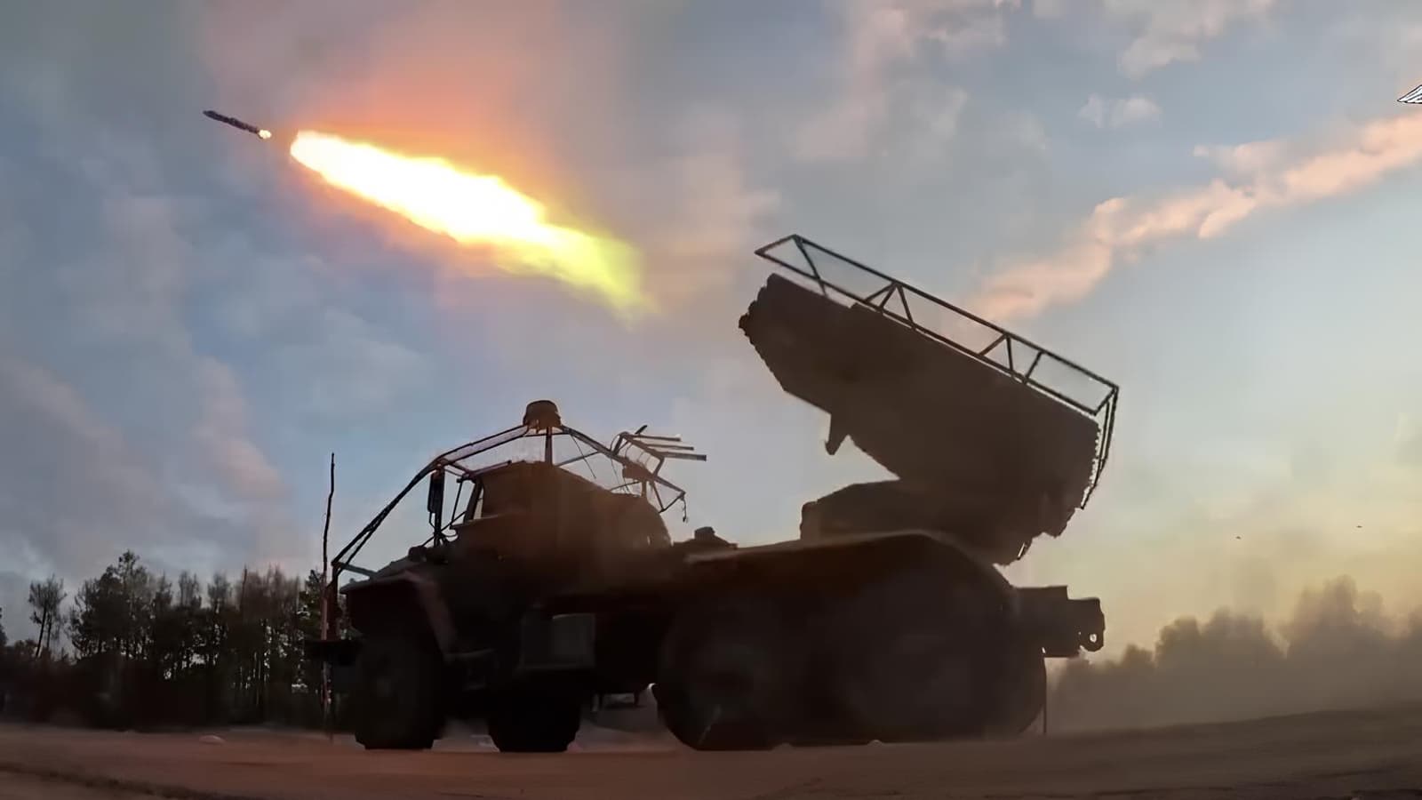 Минобороны показало кадры боевой работы расчёт реактивной системы залпового огня (РСЗО) «Град». Расчёт выпустил по цели пакет реактивных снарядов 9М53Ф.