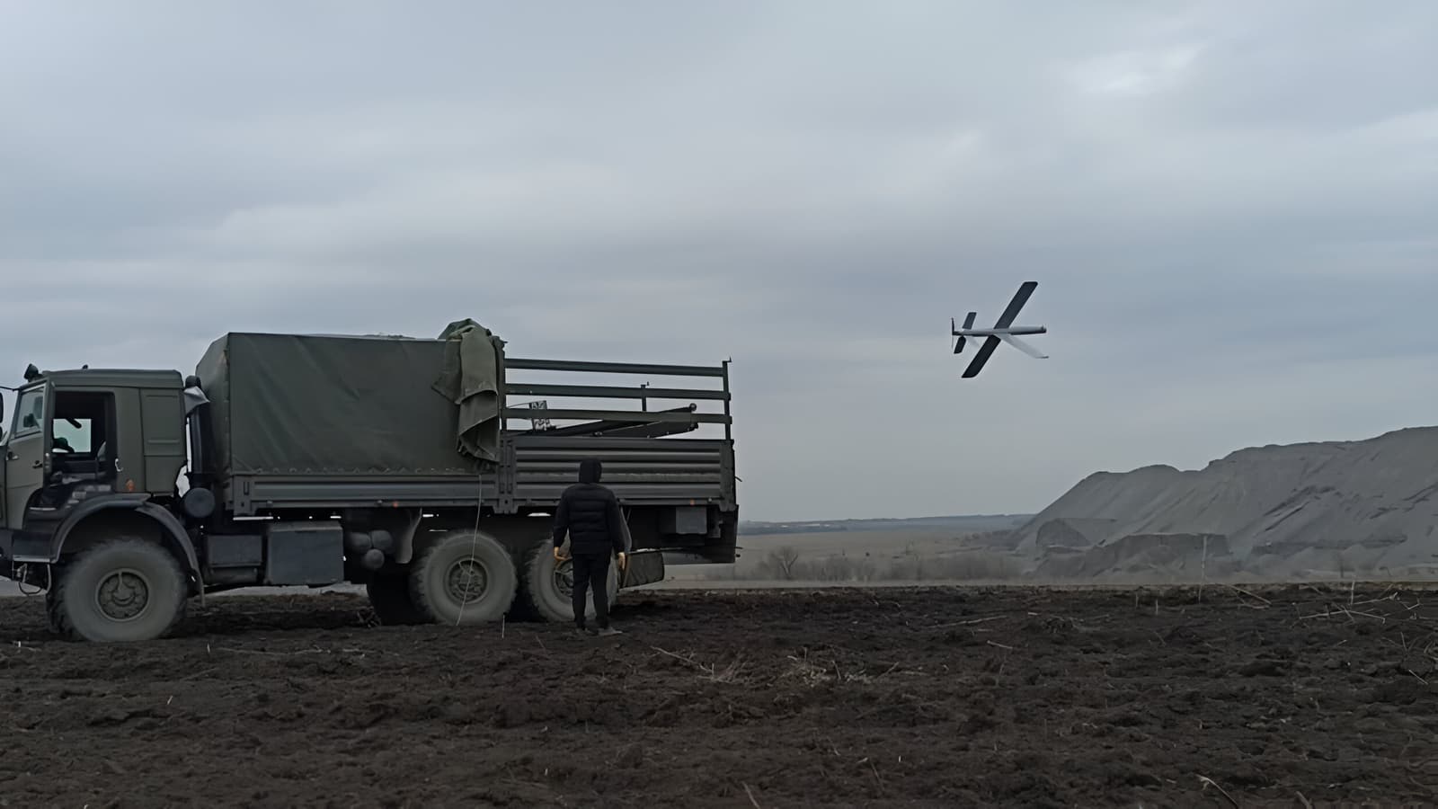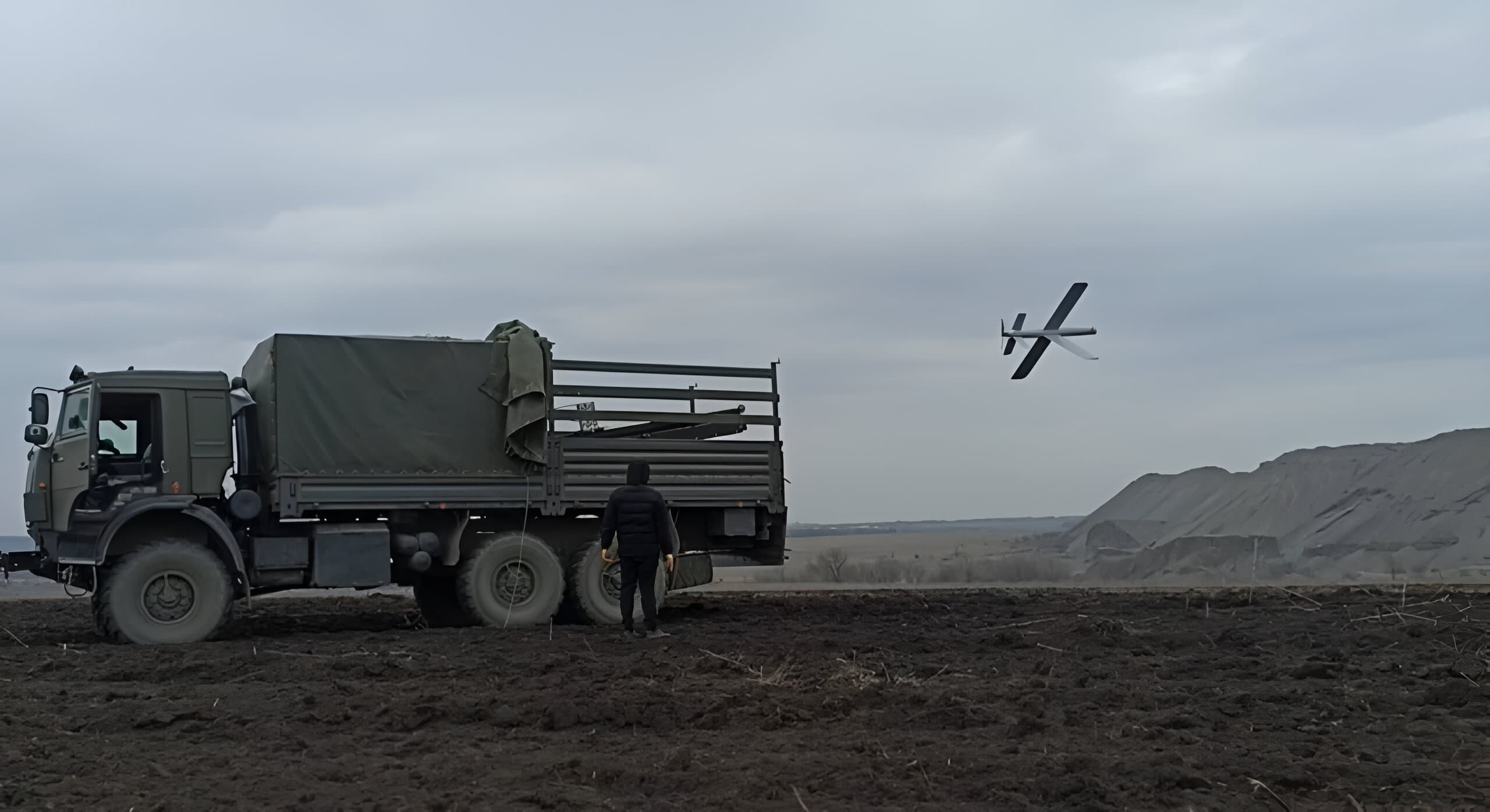 На снимке можно разглядеть, что беспилотник взлетает прямо с кузова КамАЗа. Благодаря такому нововведению расчеты БПЛА имеют возможность оперативно передвигаться по линии боевого соприкосновения.