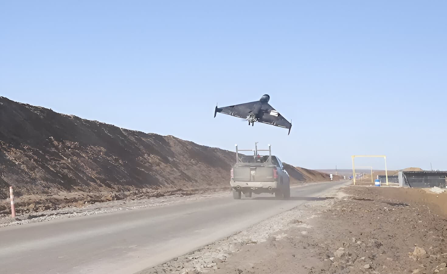 На видео можно заметить, как автомобиль разгоняется, а беспилотник взмывает в небе с катапульты, установленной в кузове автомобиля.