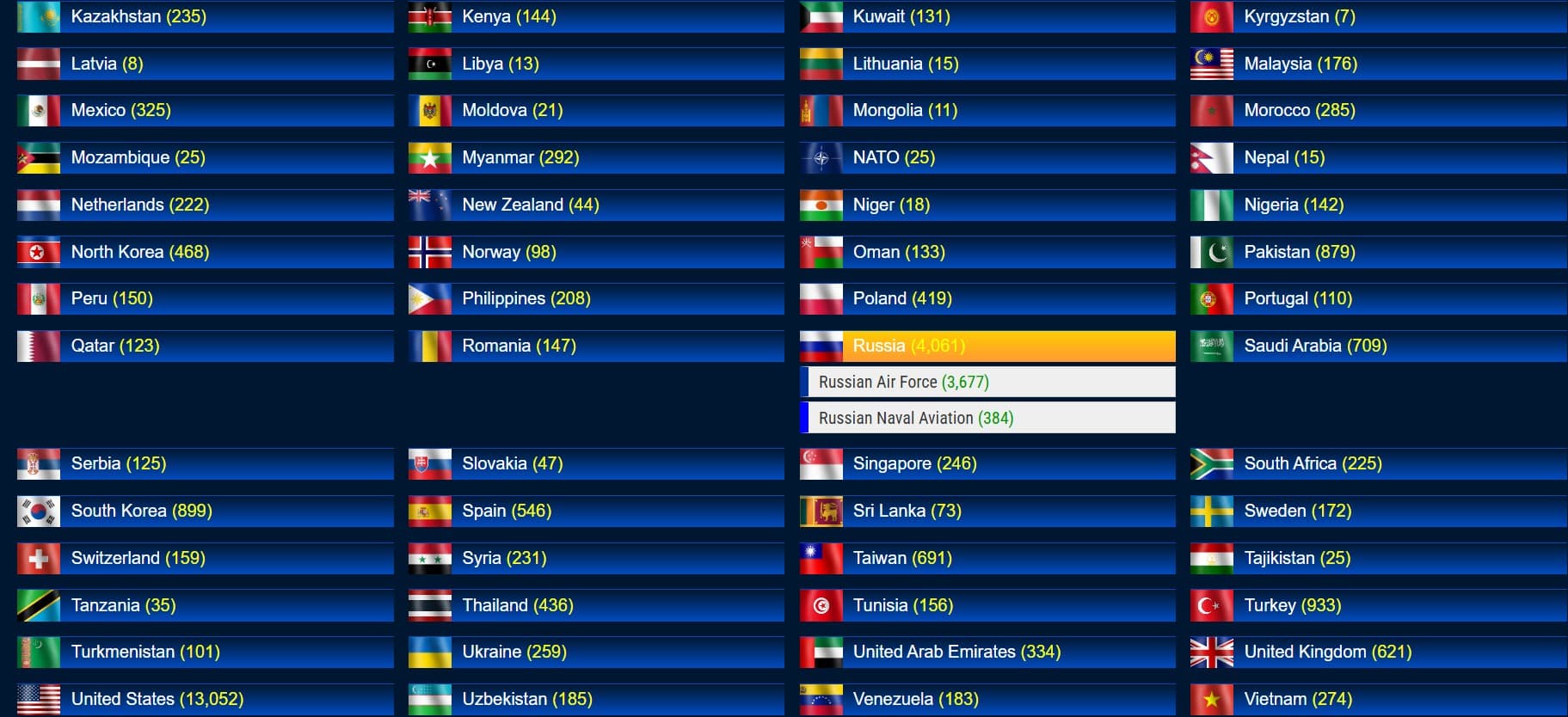 Западные эксперты насчитали 4061 российский самолет и вертолёт (3677 единиц в составе ВКС России и 384 единицы в составе морской авиации ВМФ России). В рейтинге в том числе учитывались истребители Су-24, Су-34, Су-27, Су-35, перехватчики МиГ-29, МиГ-31, МиГ-35, бомбардировщики Ту-160, Ту-95, Ту-22, штурмовики Су-25, военно-транспортные Ил-76, учебные самолеты Як-130, вертолеты Ми-8.