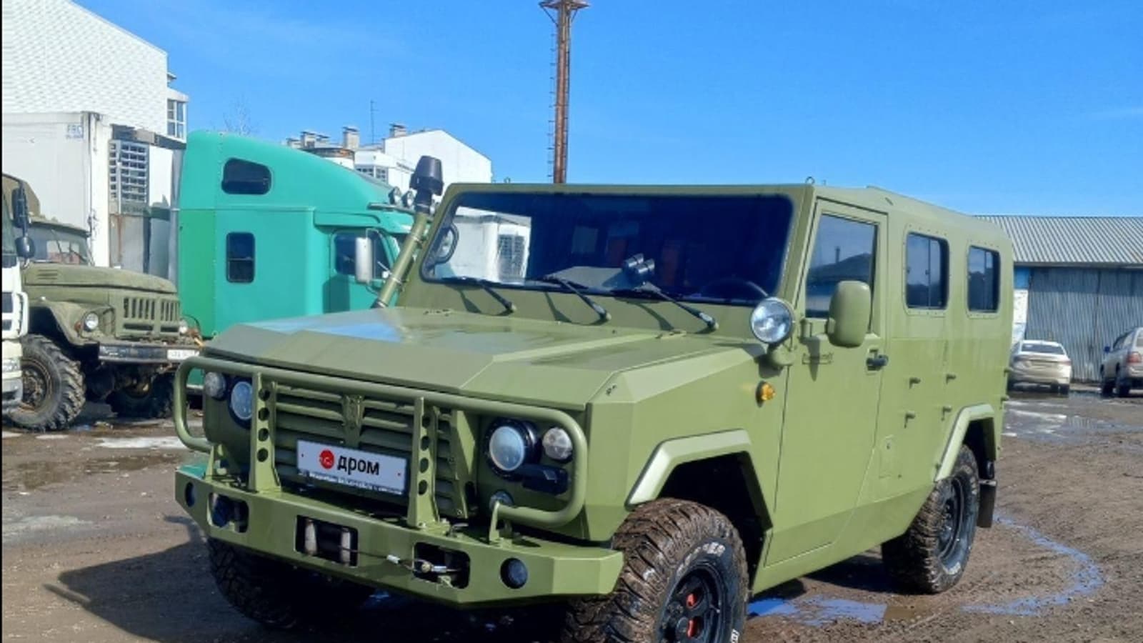 Пятиступенчатая механическая коробка передач установлена от УАЗ «Патриот». Подвеска — от пикапов Ford F-серии. Сидения выполнены из кожзама, кузов окрашен в защитный зеленый цвет. Цена — 3,9 млн рублей.