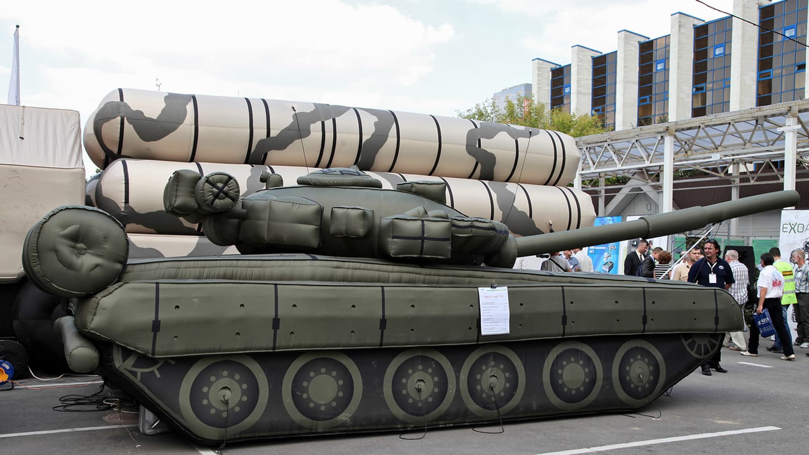 Российские военные на линии боевого соприкосновения выставили копии боевой техники в полный размер. Создать копию практически любого вида вооружения или даже вертолет Ми-8 с лопастями можно с помощью лишь генератора и насоса.