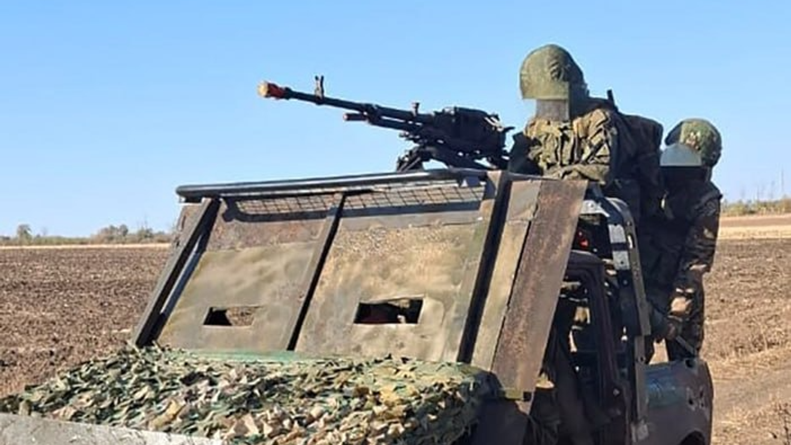 «Постапокалиптичный» автомобиль российских бойцов построили на шасси внедорожника «Нива». Машину лишили стекол, дверей и задней части крыши, а переднюю часть багги защитили толстыми листами стали. На крыше установили пулемет «Утес» калибра 12,7 мм.