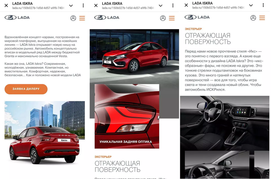 Главное внимание в материалах уделили седану в тёмно-красном цвете. АвтоВАЗ подчёркивает, что Lada Iskra вдохновлена концепт-карами и «сделана на мировой платформе».