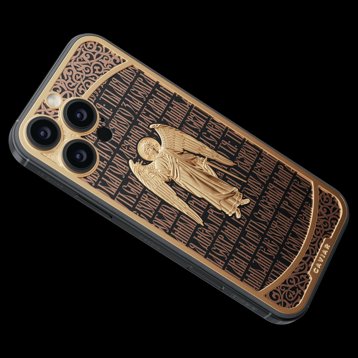 Смартфон «Ангел-Хранитель» в корпусе iPhone 16 Pro, украшенный драгоценными камнями и покрытый золотом. Концепция устройства была разработана с использованием искусственного интеллекта, который помог создать уникальный дизайн, соответствующий современным требованиям. Новая модель пополнила коллекцию кастомных смартфонов бренда Caviar с названием «Религия».