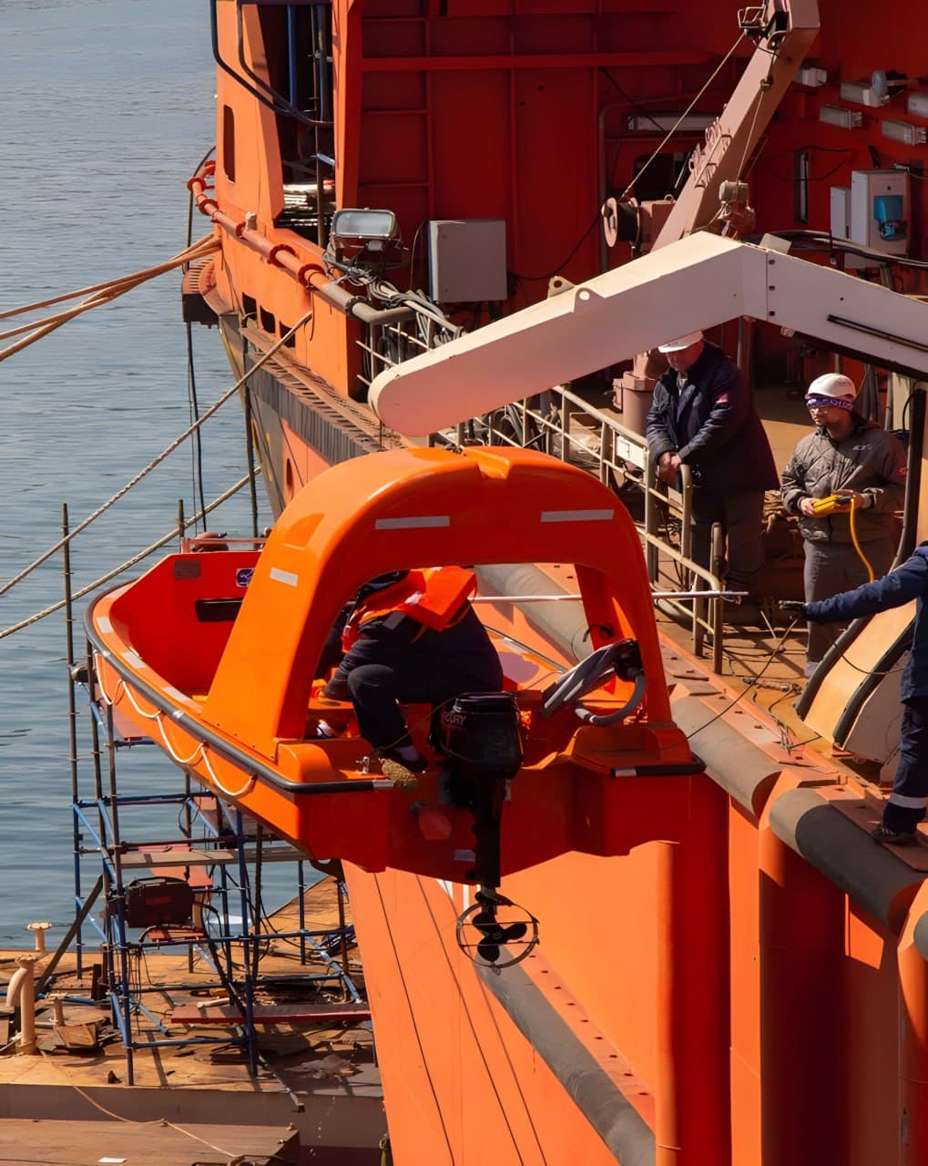 На заводе также произведены пуско-наладочные работы и испытания спускоподъемного устройства и дежурной шлюпки. Механизмы были проверены в действии, с рабочей нагрузкой.