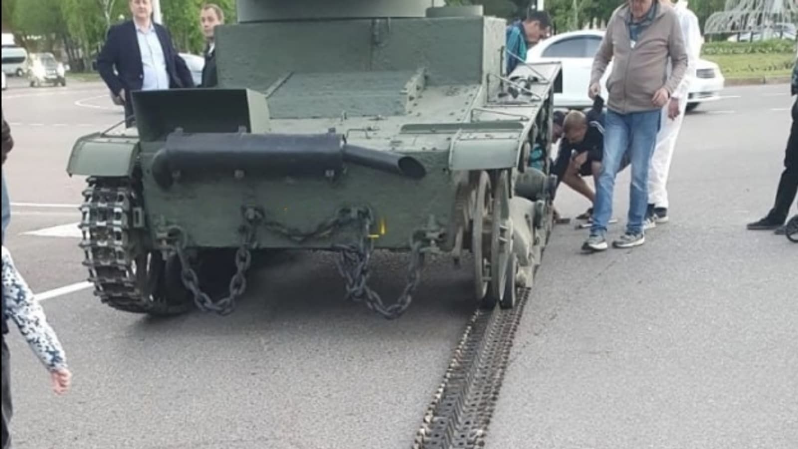 В Стерлитамаке (Башкортостан) «разулся» танк Т-26, который следовал через город для репетиции парада. Кадры появились в социальных сетях.