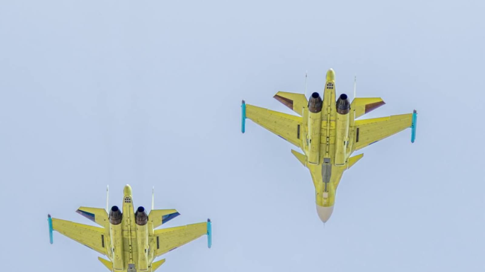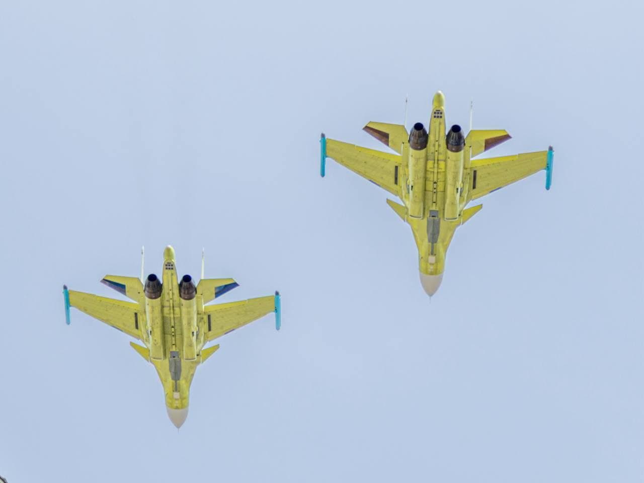 Обращает на себя внимание необычный желтый цвет «утят». Су-34 в строевых частях Воздушно-космических сил России, как правило, представлено в бело-голубом цвете. Вероятно, новые машины пока еще не прошли стадию покраски.