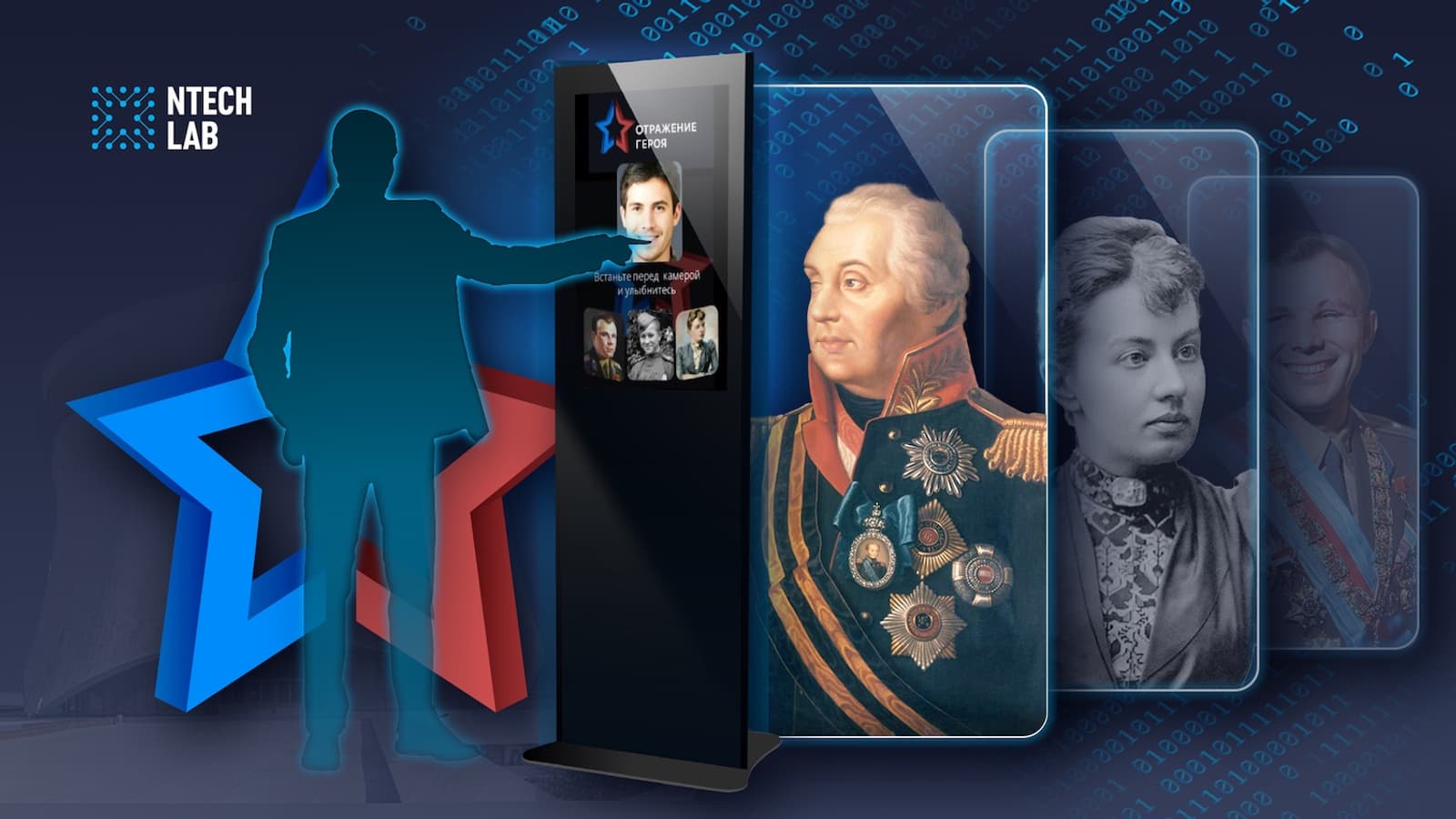 Компания NtechLab запустила масштабный патриотический проект «Отражение героя», который позволяет каждому россиянину найти исторического персонажа, максимально похожего на него по внешности. Это возможно благодаря инфостелам, установленных в разных городах России, где используется система видеоаналитики на базе искусственного интеллекта.