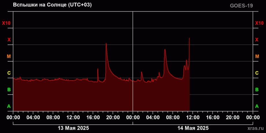 После длительного затишья возмущения на Солнце набирают обороты. Вспышка, произошедшая 13 мая, повлекла за собой рост потока заряженных частиц наблюдали у обриты Земли, они увеличились в 50 раз. Это может оказывать влияние на работу космических аппаратов, а также вызывать магнитные бури на Земле.