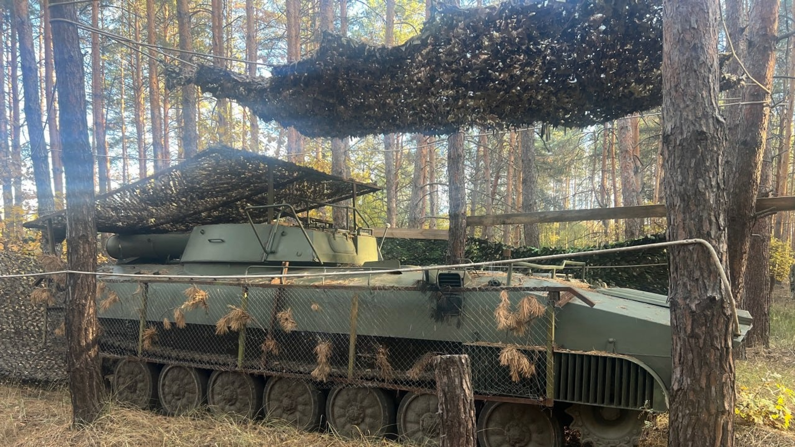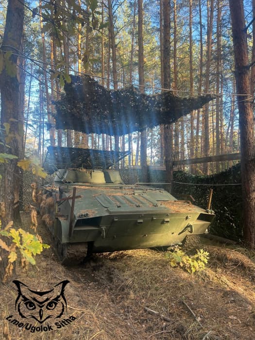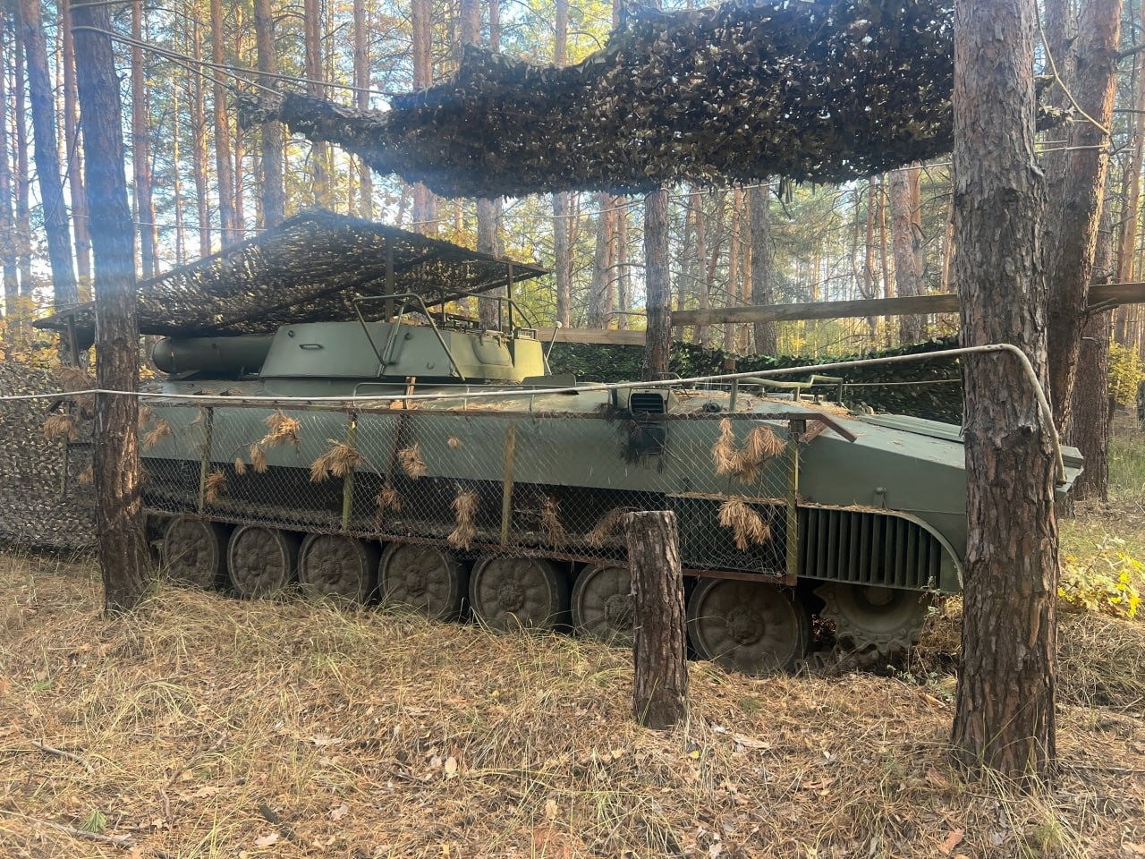 На фотографии можно увидеть самоходную установку с решетчатыми экранами, которыми прикрыли борт корпуса. Также машина получила «мангал» над пусковой установкой с зарядами разминирования. Эти конструкции могут защитить от дронов УР-77, которые несут большое количество взрывчатки.