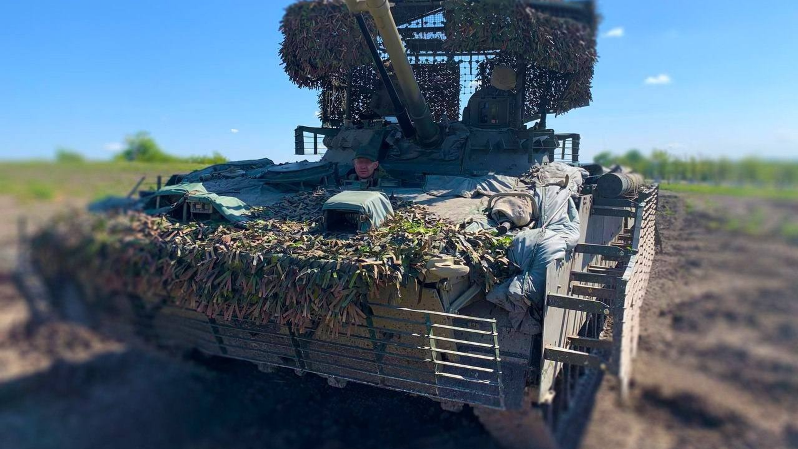 Машина в «максимальной комплектации» оснащена антидроновым козырьком для защиты башни и комплектом дополнительной брони 688А-сб6-2КП.