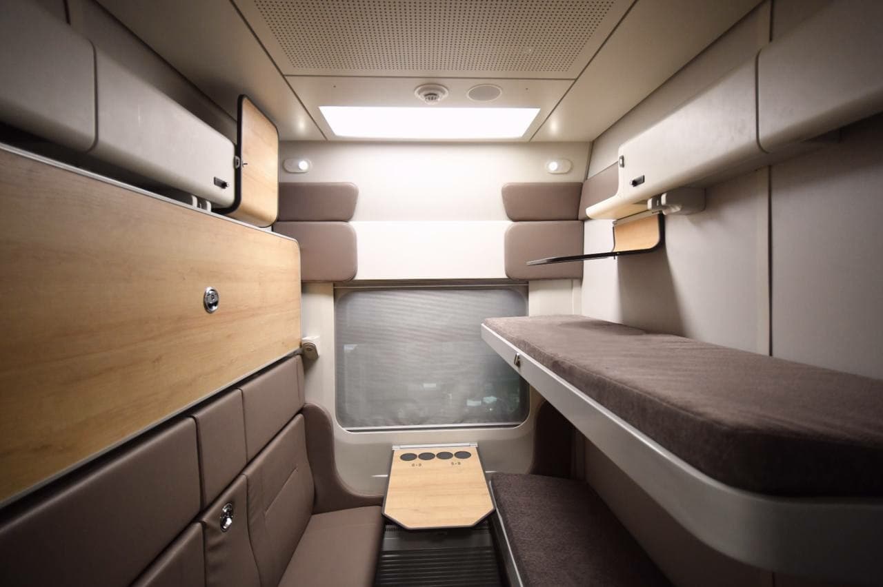 Купе оснащены столиками с встроенными зарядками, системой регулирования температуры, индивидуальными откидными столиками для планшетов и ноутбуков, расположенными на верхних полках и другими удобствами.