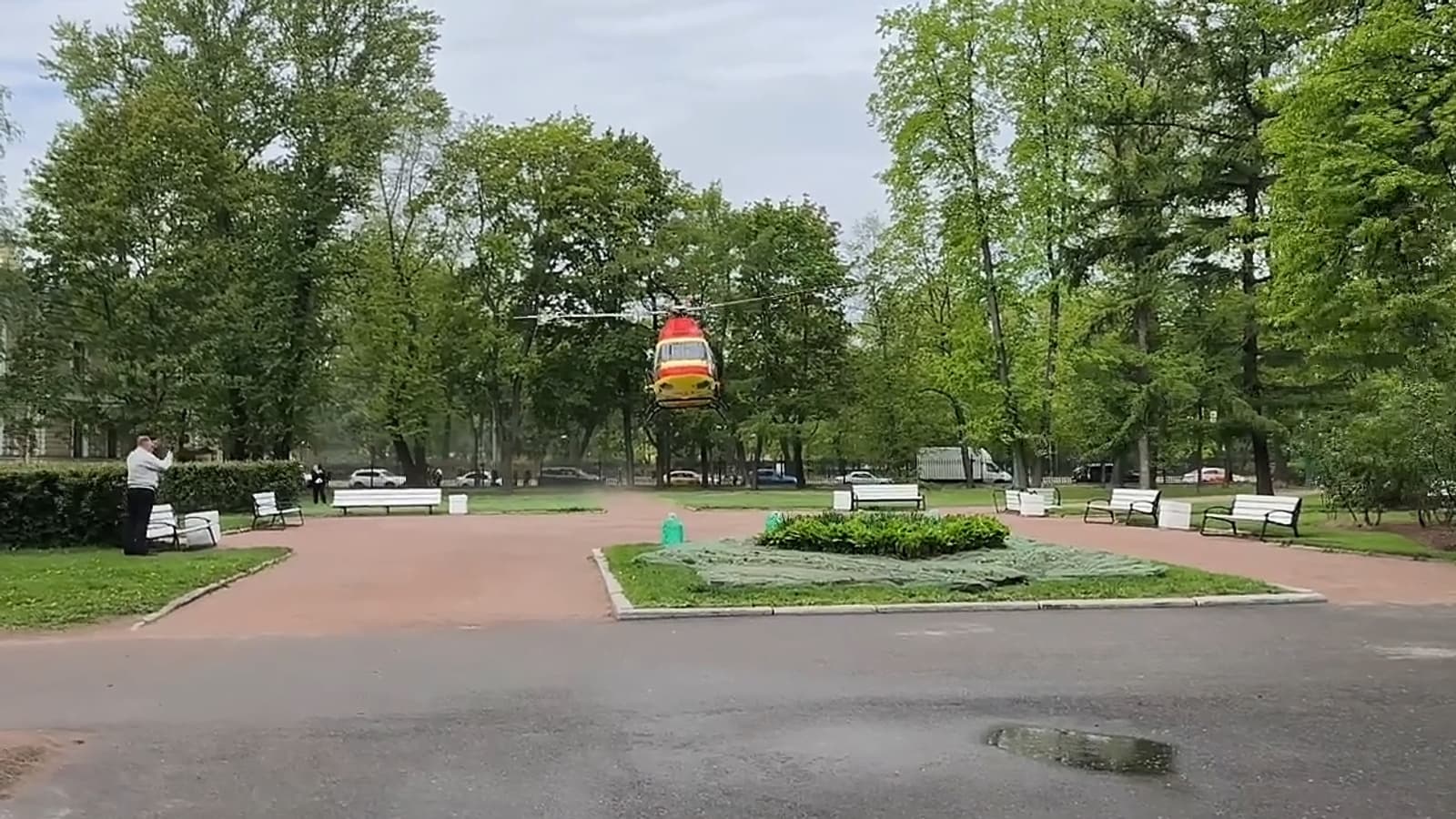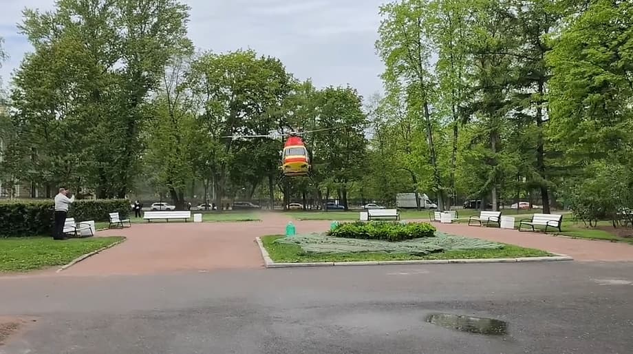 Машина приземлилась прямо в центре Санкт-Петербурга, в парковой зоне недалеко от Михайловского замка. Посадка в условиях плотной городской застройки требует не только высочайшего мастерства экипажа, но и сверхточных реакций от вертолета.