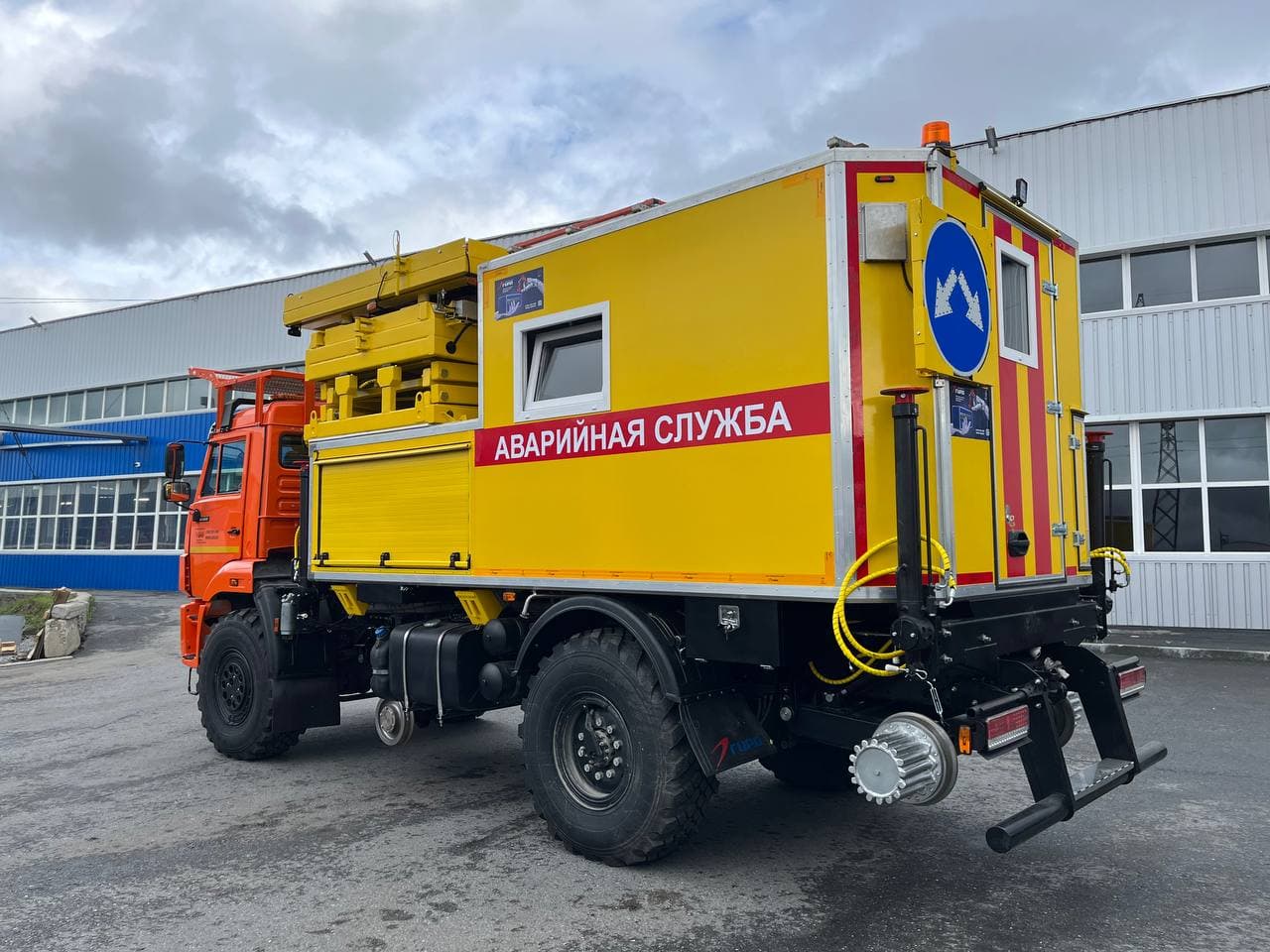 Сам фургон сделан из сэндвич-панелей. Внутри установлено 2 сидения с ремнями безопасности, рундук для перевозки запчастей, лестница для подъёма с рифленым покрытием. Для связи с водителем установили переговорное устройство.