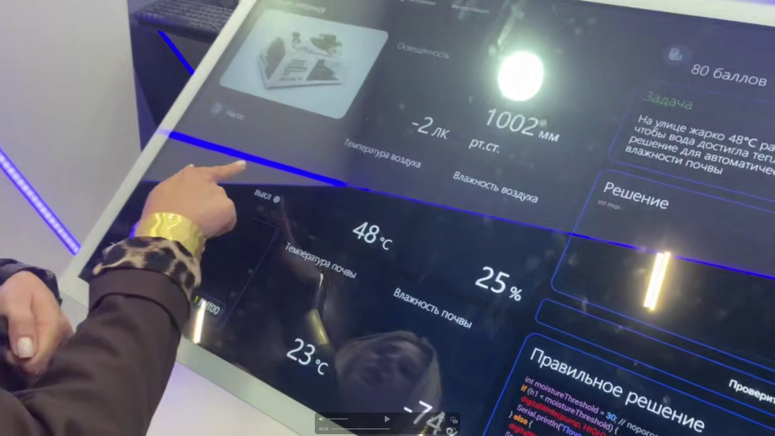 Задача ребенка – подобрать цифровое решение: отключить свет, включить вентиляцию или снизить влажность. Всё это делается через сенсорный интерфейс.