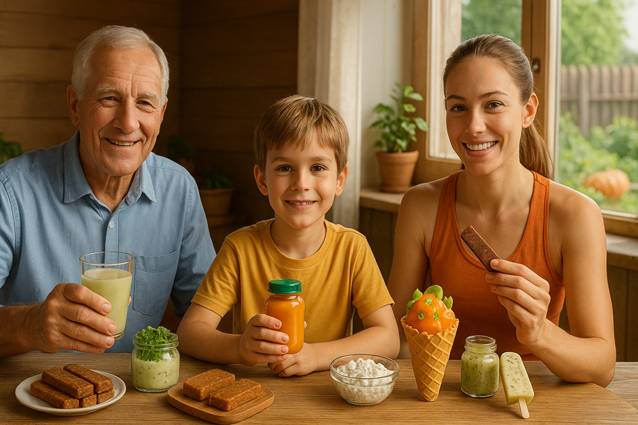 Для детей разработаны гипоаллергенные мясорастительные консервы с кивано и бенинказой, легко усваиваемые и насыщенные витаминами. Для пожилых — молочные и мясные продукты с природными тритерпеноидными добавками, улучшающими обмен веществ и иммунитет.