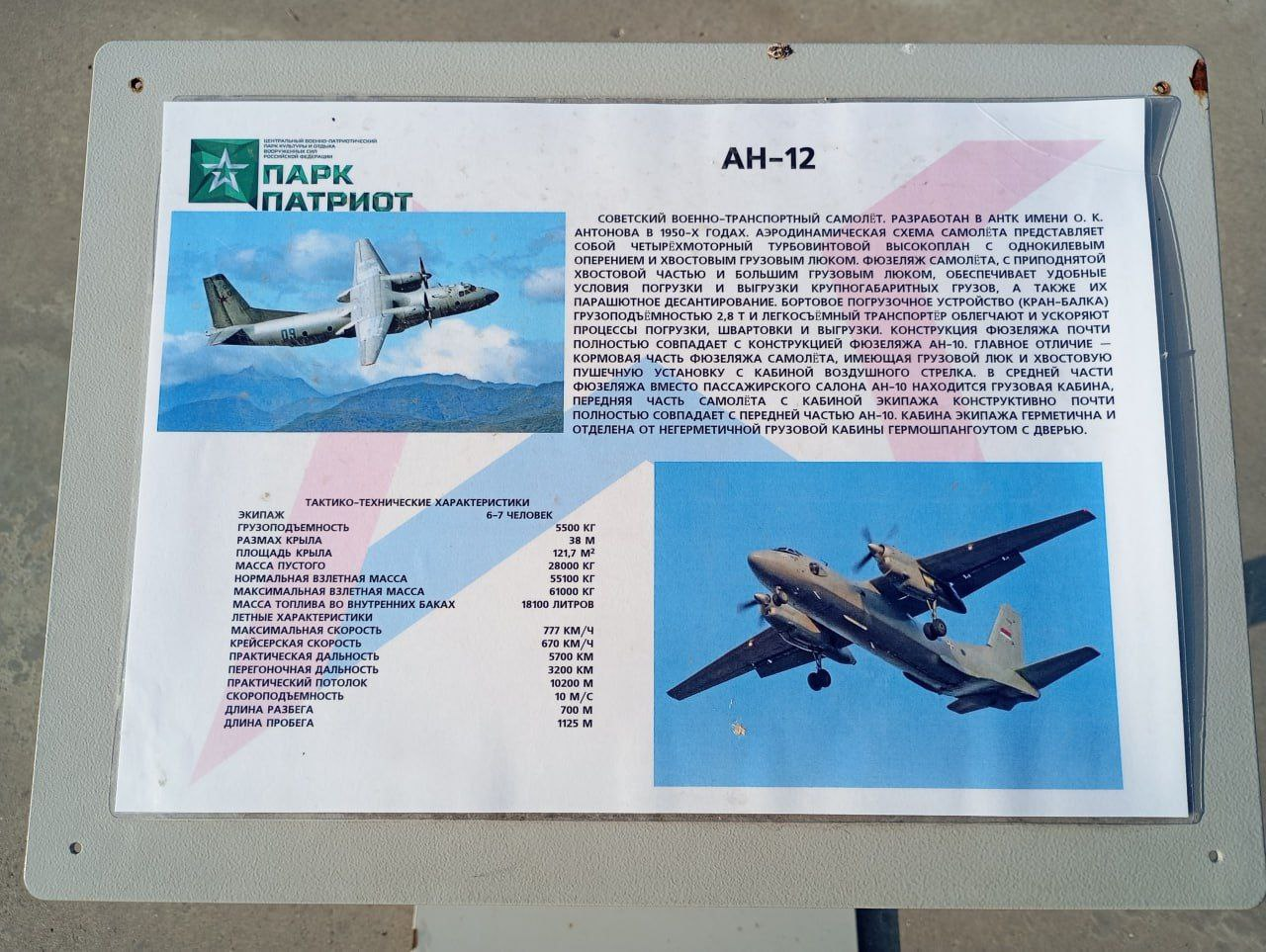 «Парк Патриот» ошибся в представленных фотографиях к описанию самолёта Ан-12. Вместо четырехвинтового самолёта на картинке показали двухвинтовой Ан-26, хотя описание написано правильно.