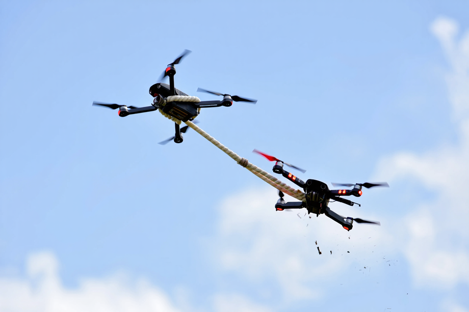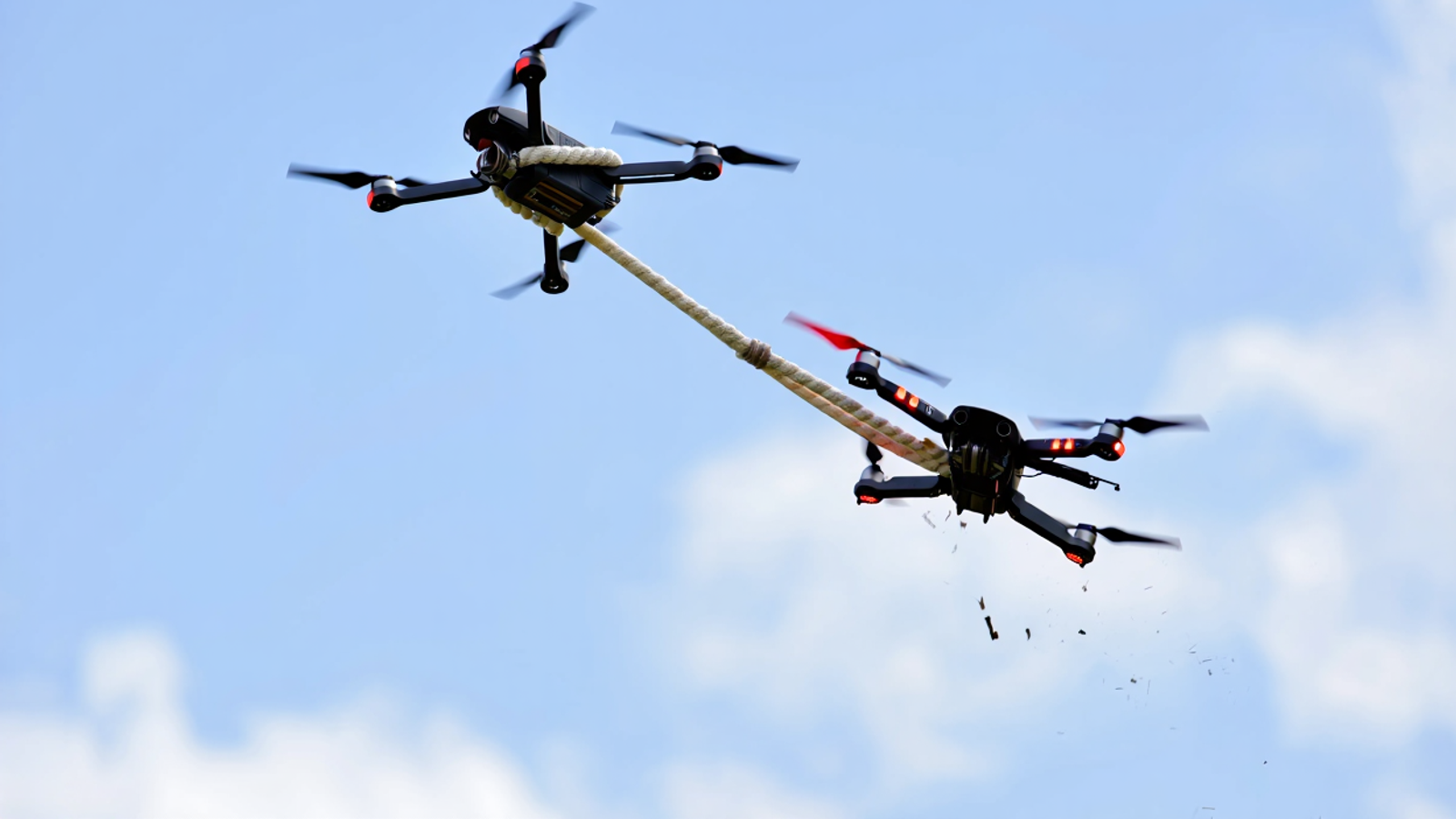 Дрон подлетает к беспилотнику противника, цепляется за лопасти и сбивает его.