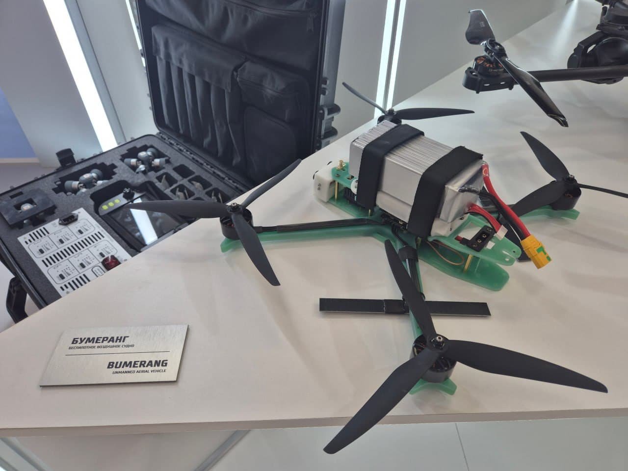 «Бумеранг» имеет простую конструкцию: 4 винта, двигателя, массивная аккумуляторная батарея. В специальной емкости, заполненной поражающими элементами, находится пластид и взрыватель.