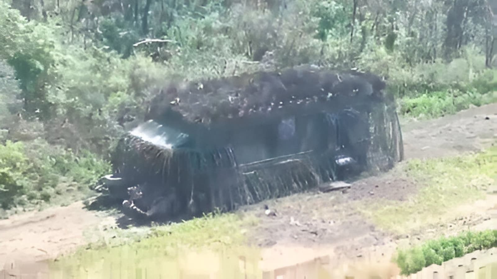 Машина напоминает тяжелые штурмовые БТР, что уже показывали ранее. Для ещё большей невосприимчивости к дронам здесь применили так называемые «косички» — расплетенные стальные тросы, развешанные спереди, сзади и по бортам.