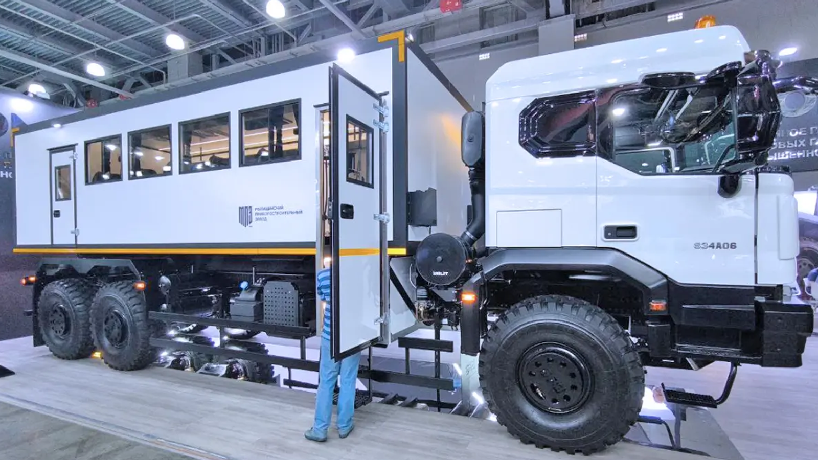 Производство новых грузовых автомобилей БАЗ на заводе в Ленинградской области стартовало в 2025 году. Машины собираются из комплектующих, произведенных как в России, так и в Беларуси. Недавно были представлены две модели тягач БАЗ-S34А11 и самосвал БАЗ-S32А51. Теперь к ним добавилась третья модель – — вахтовый автобус БАЗ-S34А06.