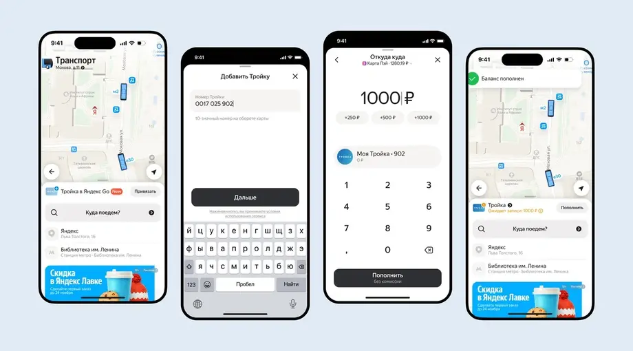 В Яндекс Go теперь можно привязать карту «Тройка» и быстро пополнять её баланс. В одном приложении стало ещё больше возможностей для тех, кто пользуется городским транспортом. «Тройка» сохраняется в аккаунте, и вы всегда видите остаток на ней. Пополнить карту можно с любой из привязанных карт.