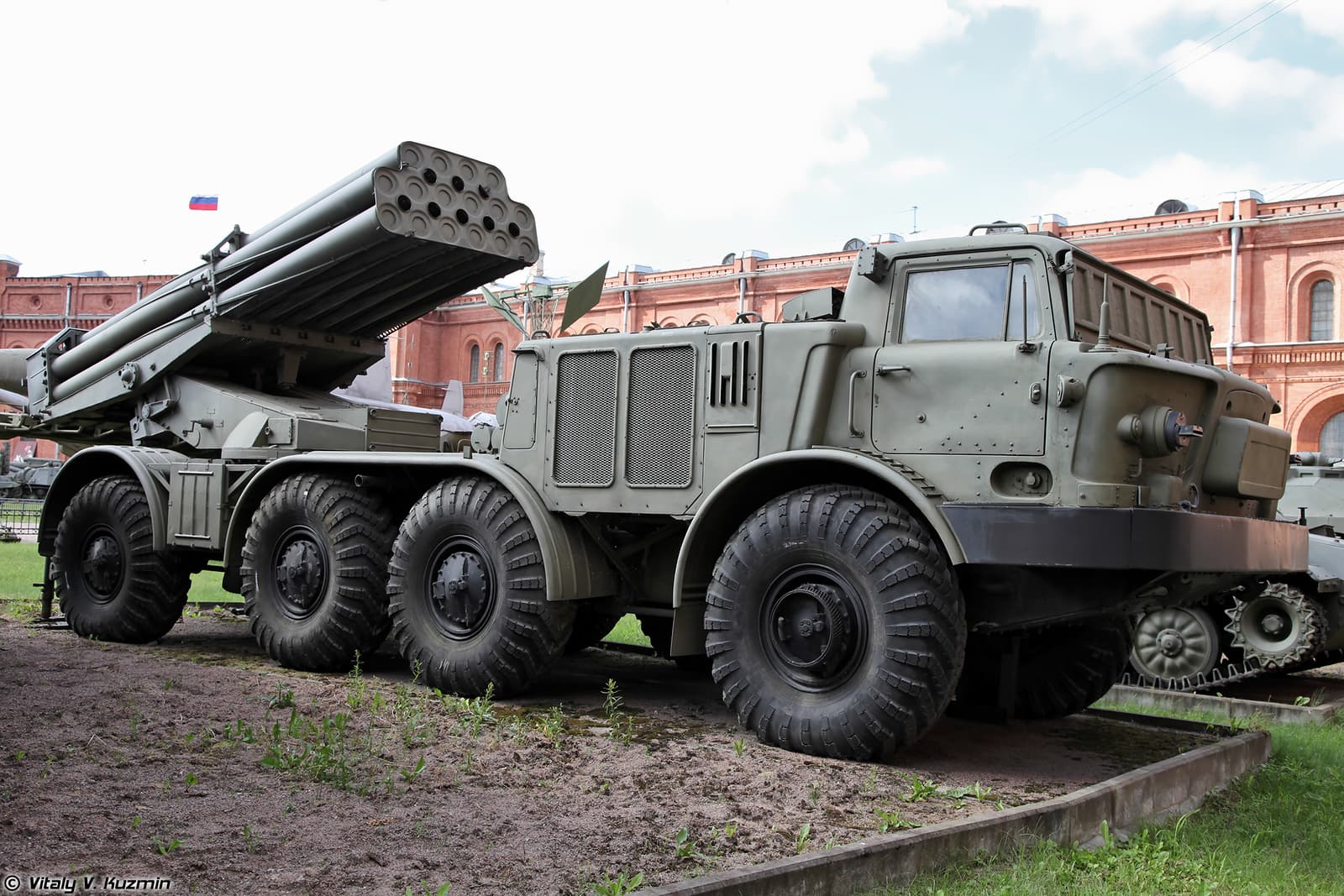 Установка на четырехосном колесном шасси несет 16 направляющих с реактивными снарядами калибра 220 мм. Стандартный фугасный снаряд несет боевую часть весом 100 кг. Максимальная дальность стрельбы «Урагана» — 35 км.
