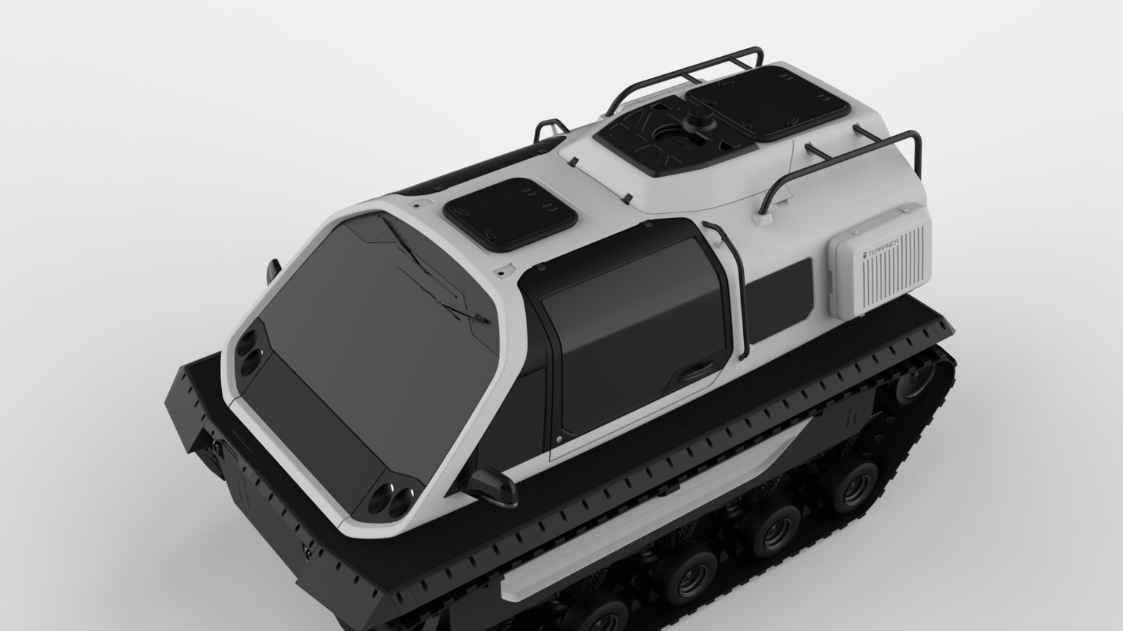 Этот вездеход имеет цельную раму, в конструкции которой используются пластиковые панели (внешние и внутренние), некоторые из которых укреплены пенополиуретаном. Его герметичное шасси, подобно корпусу лодки, дополнено боковыми понтонами внутри гусениц для обеспечения плавучести и устойчивости на воде. Движение обеспечивается гибридной системой: турбодвигатель с генератором, аккумуляторная батарея (до 3 часов автономной работы) и два электромотора мощностью 30 кВт на передние катки. В будущих серийных моделях мощность электромоторов планируется увеличить до 40–50 кВт.