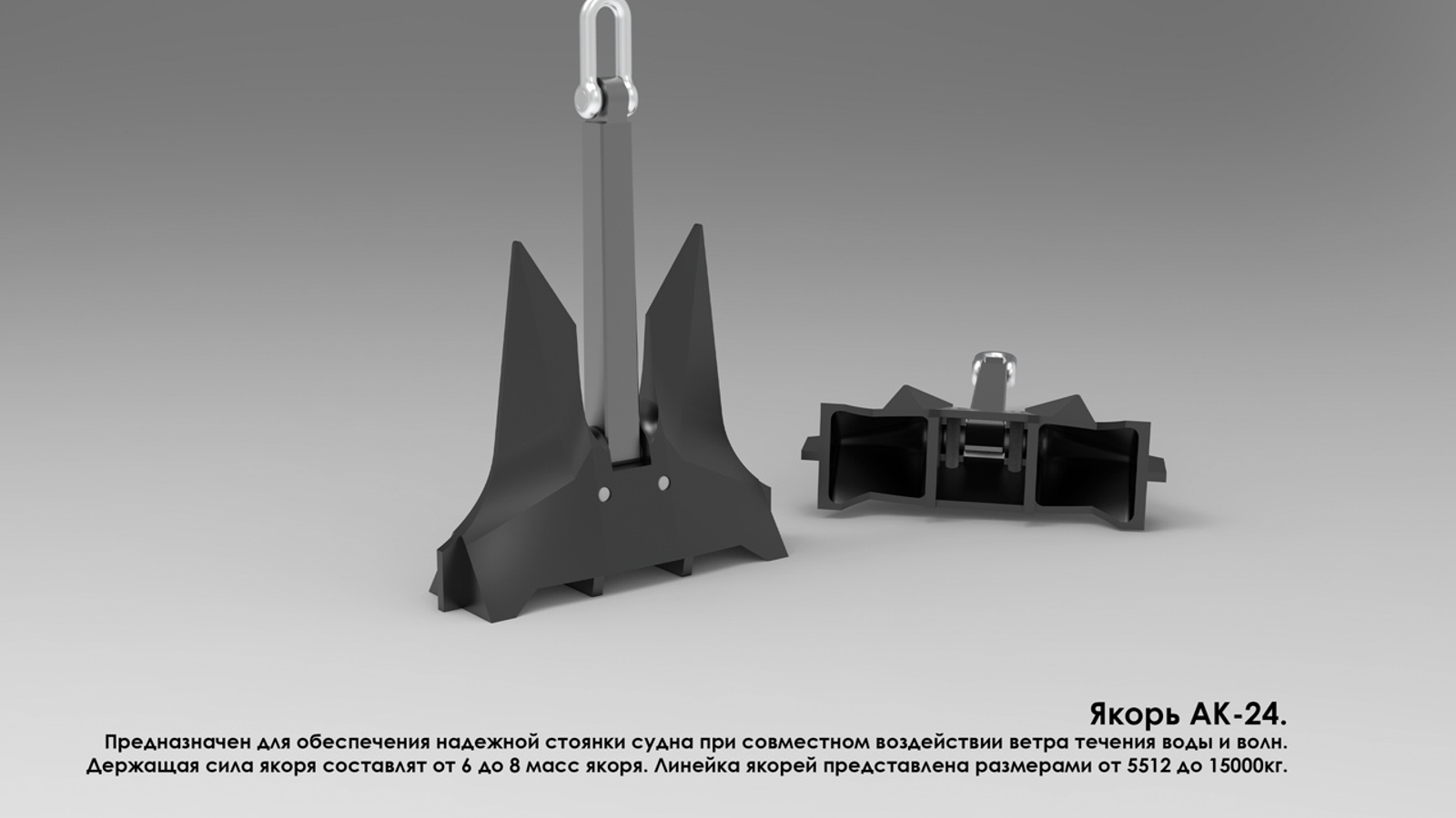 Якорь АК-24 предназначен для фиксации судна при сильном ветре, течении и волнении. Его держащая сила составляет от 6 до 8 собственных масс. В новой модели инженеры СКБ-2 КМЗ применили инновационное решение, ранее не использовавшееся в подобных конструкциях. Линейка якорей АК-24Б включает модели весом от 5512 до 15000 кг. Вся документация прошла проверку и одобрение Российского морского регистра судоходства. Это подтверждает соответствие изделия требованиям безопасности и надежности.