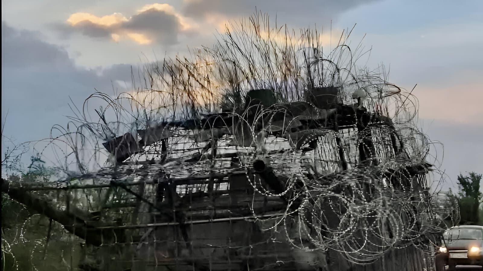 В Сети появились кадры максимально защищенной гусеничной бронированной машины. Умельцы обвесили ее транспортерной лентой, свисающей практически до самой земли. Поверх нее установили усиленную стальными цепями решетчатую конструкцию.