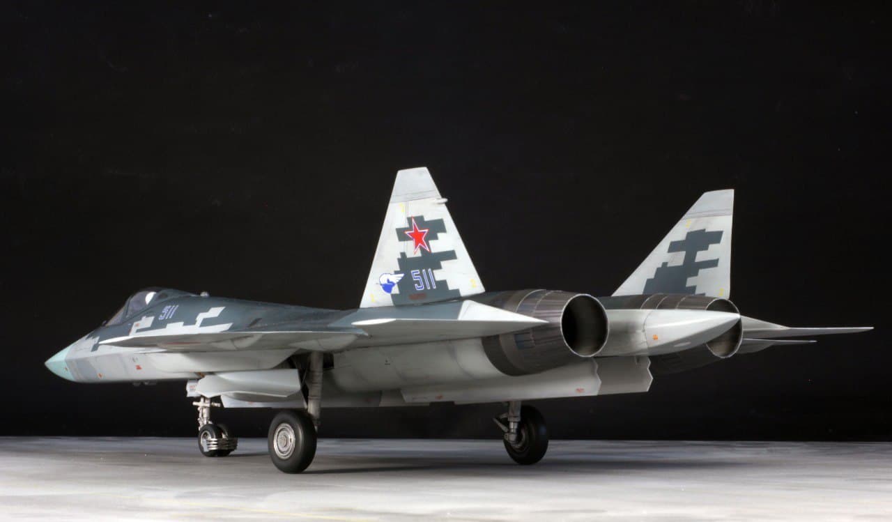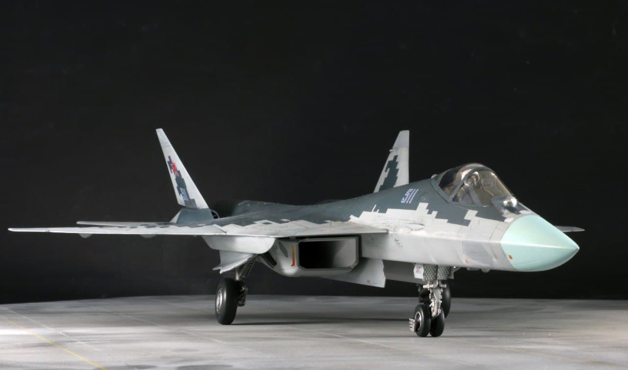 В Сети появились кадры первого детального макета многофункционального истребителя пятого поколения Су-57. Самолёт представили в привычной для Воздушно-космических сил (ВКС) России бело-голубой расцветке.