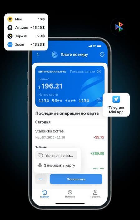 Процедура оформления карты занимает минимальное время и доступна в разделе «Финсервисы» мобильного приложения T2. Пополнение счёта осуществляется в рублях посредством Системы быстрых платежей с автоматической конвертацией в доллары США.