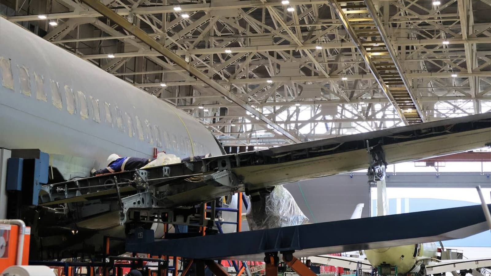 Современное оборудование позволяет с высокой точностью соединять отъемную часть крыла с основным корпусом самолета.