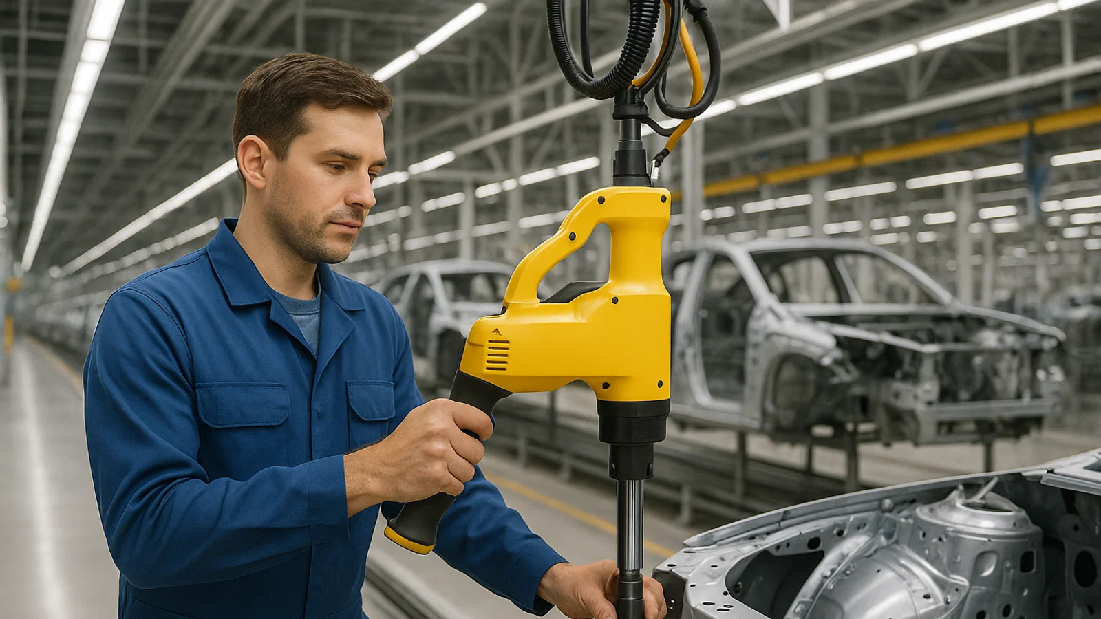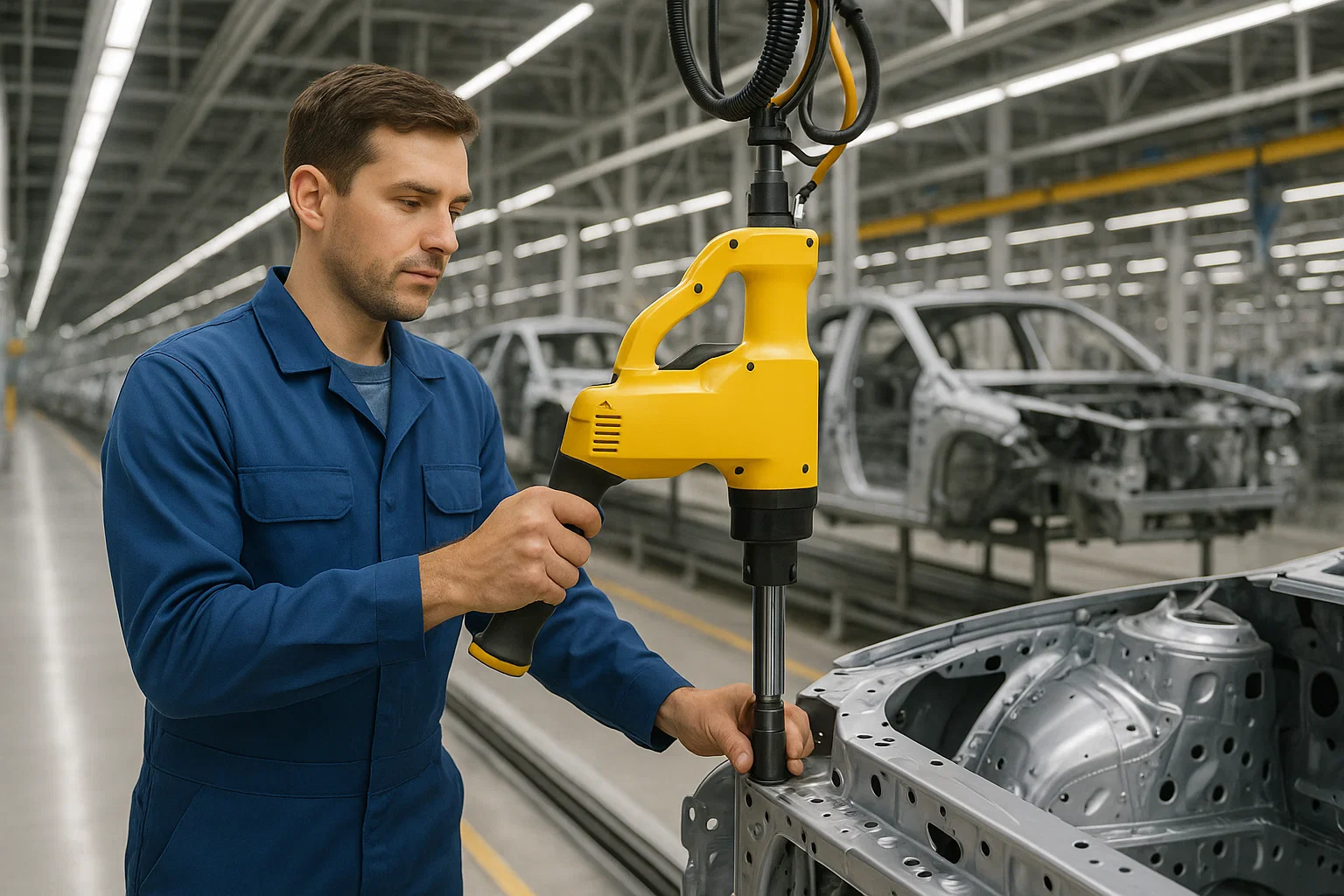 Гайковерт действительно надежный — тихоходный, но мощный. Ещё одно его преимущество заключается в плавности хода и отсутствии вибрации. Работникам уже не нужно прилагать усилий ни для закручивания гаек, ни для подвода системы к идущему по конвейеру шасси.