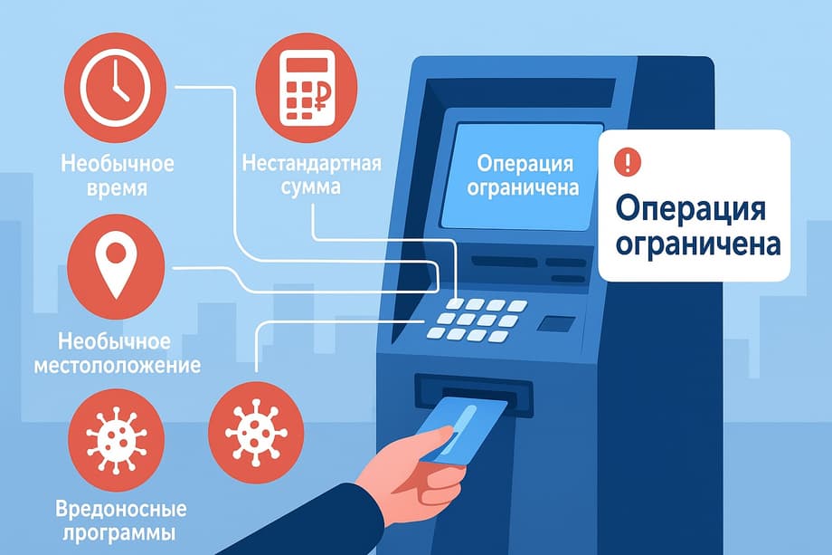 ЦБ РФ определил девять признаков подозрительных операций. Среди них: непривычное время суток, нестандартная сумма, необычное местоположение банкомата, использование нового способа снятия средств, резкое изменение активности звонков и сообщений, снятие денег вскоре после оформления кредита или повышения лимита, смена номера телефона, изменения характеристик устройства и наличие вредоносных программ. Для токенизированных карт предусмотрены отдельные критерии.