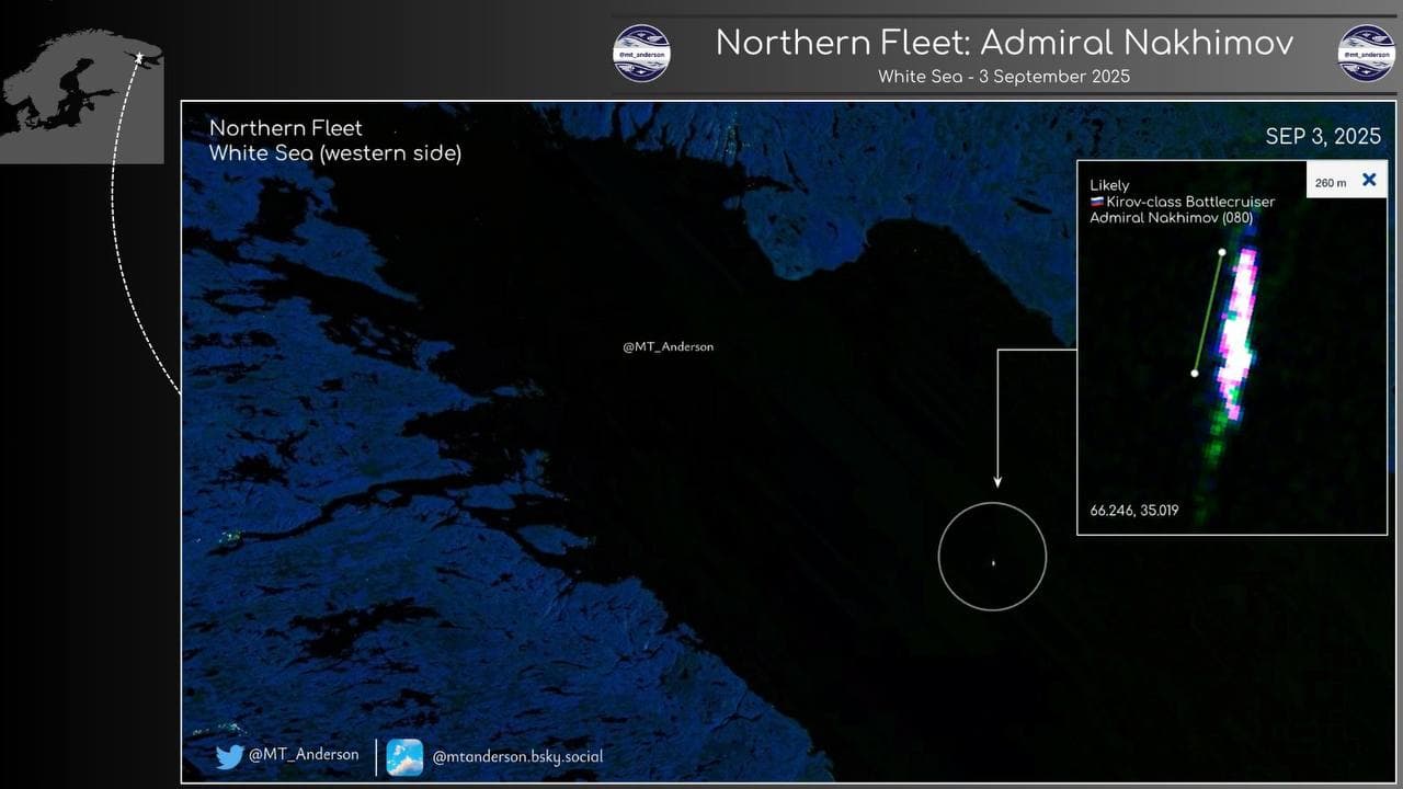 В Сети появились спутниковые снимки российского крейсера проекта 1144.2 «Адмирал Нахимов». Корабль передвигался в районе Кандалакшского залива в Белом море.