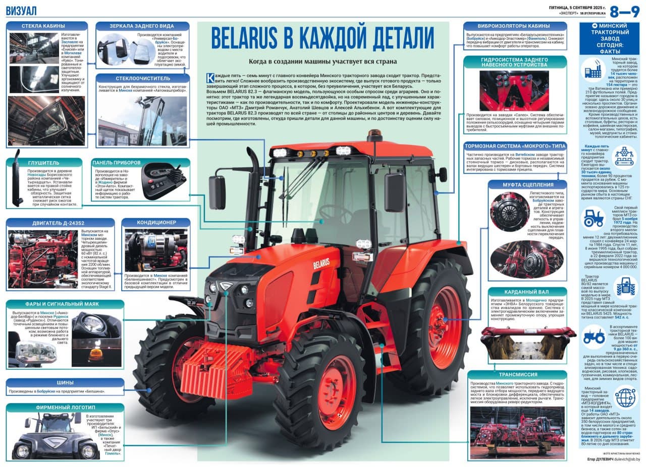 Минский тракторный завод (МТЗ) использует только белорусские агрегаты, узлы и детали для своей техники. Об этом говорится в статье газеты «Республика», посвященная трактору BELARUS 82.3.