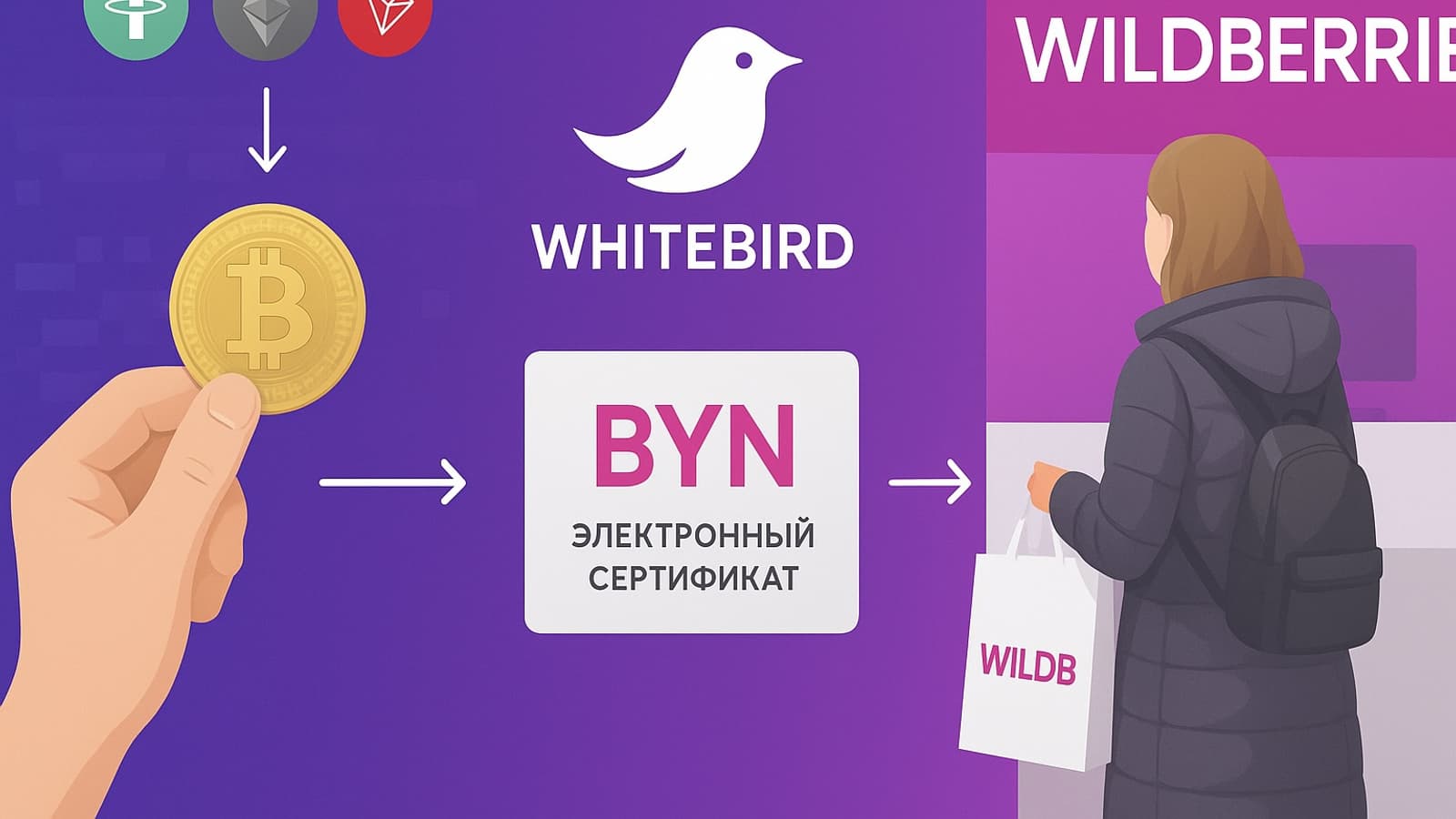 Покупатель выбирает опцию «Оплатить криптовалютой», после чего отправляет цифровые активы на адрес Whitebird. Платформа конвертирует их в BYN по актуальному курсу и выпускает сертификат, который автоматически зачисляется на баланс аккаунта в Wildberries. Конвертация отображается в режиме реального времени, комиссия за выпуск сертификата не взимается.
