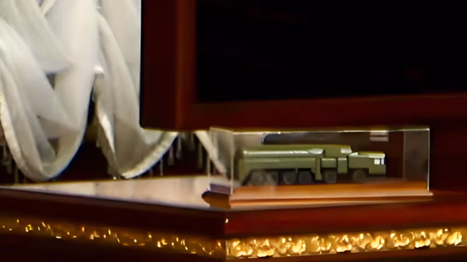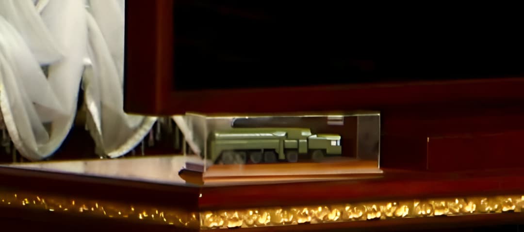 Копия установки находилась под стеклянным колпаком. Внешним видом шасси похоже на неизвестную установку, которая засветилась на улице Минска в марте 2025 года, предположительно, предназначенная для «Орешника».