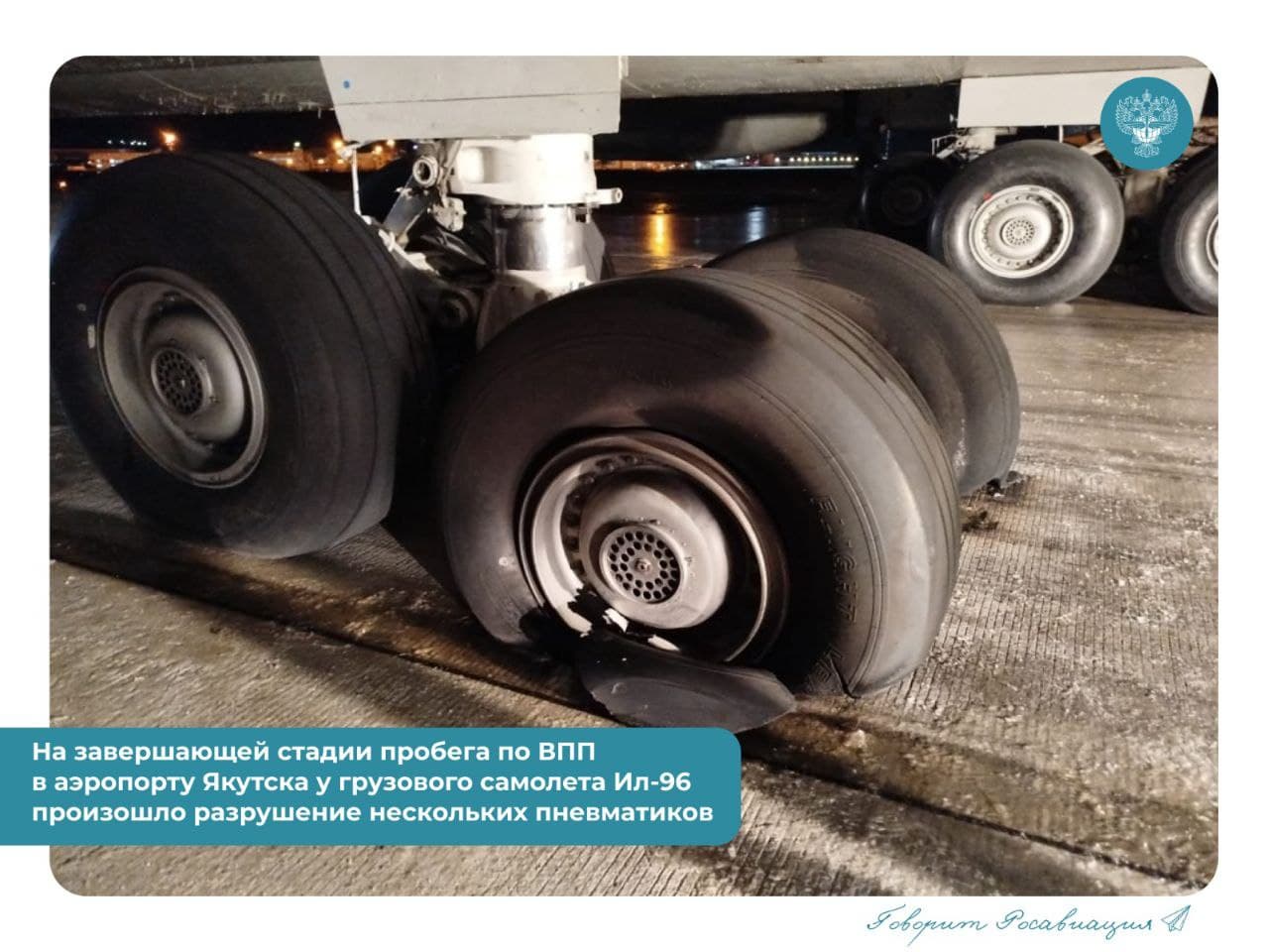 В аэропорту Якутска произошла авария с самолётом Ил-96-400Т. При посадке разрушились нескольких пневматиков левой основной опоры шасси, началось воспламенение тормозных барабанов.