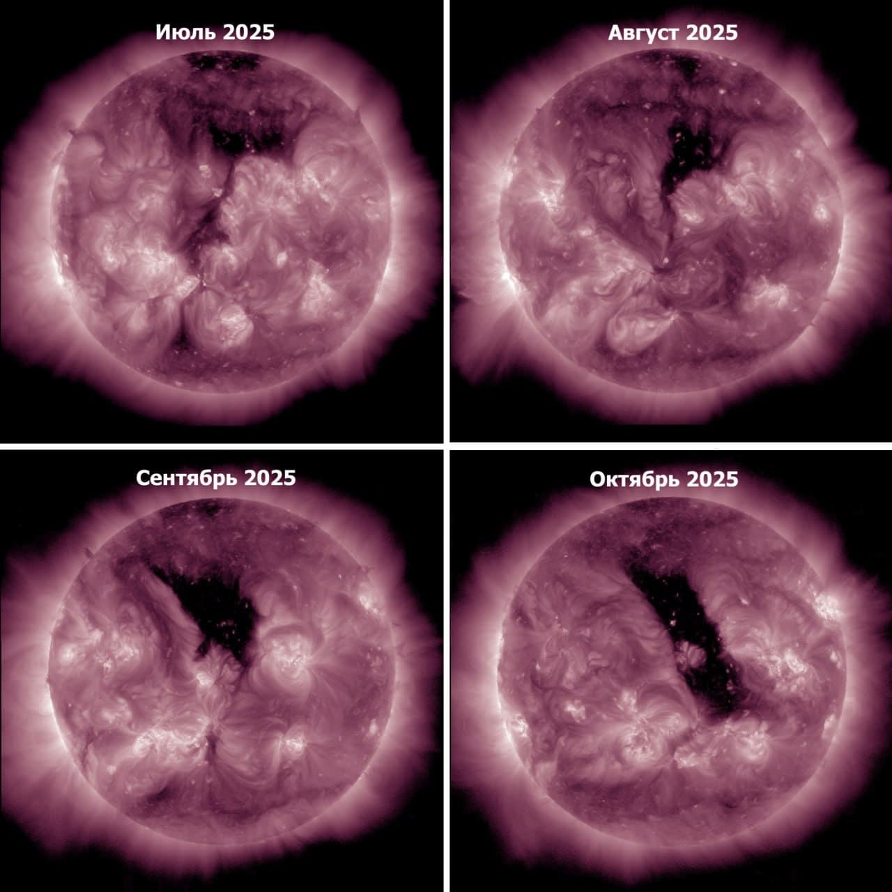 Признаки образования нынешней дыры наблюдались на Солнце ещё летом, в июле и августе. А в сентябре при прохождении по диску дыра уже имела приличную площадь, но располагалась сильно выше экватора. Тогда поток её плазмы прошёл мимо Земли.