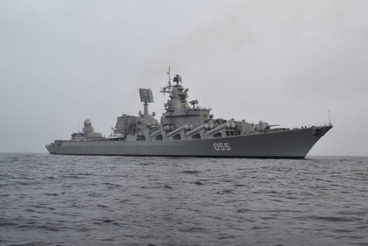 Судя по форме надстройки, расположению антенн и пусковых установок, корабль похож на ракетный крейсер проекта 1164 «Атлант» (например, «Москва», «Маршал Устинов» или «Варяг»). Эти корабли часто изображаются на фоне символики, связанной с флотом.