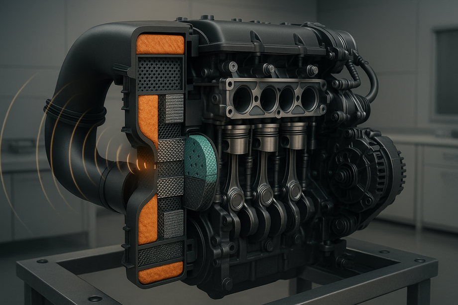Для этого межреберное пространство корпуса системы впуска заполняют термостойким вязкоупругим полимером, а внутрь вводят металлическую сетку или перфорированную пластину. Жёсткие элементы препятствуют раскачиванию стенок, а полимер гасит энергию звуковых волн, что снижает уровень шума двигателя.