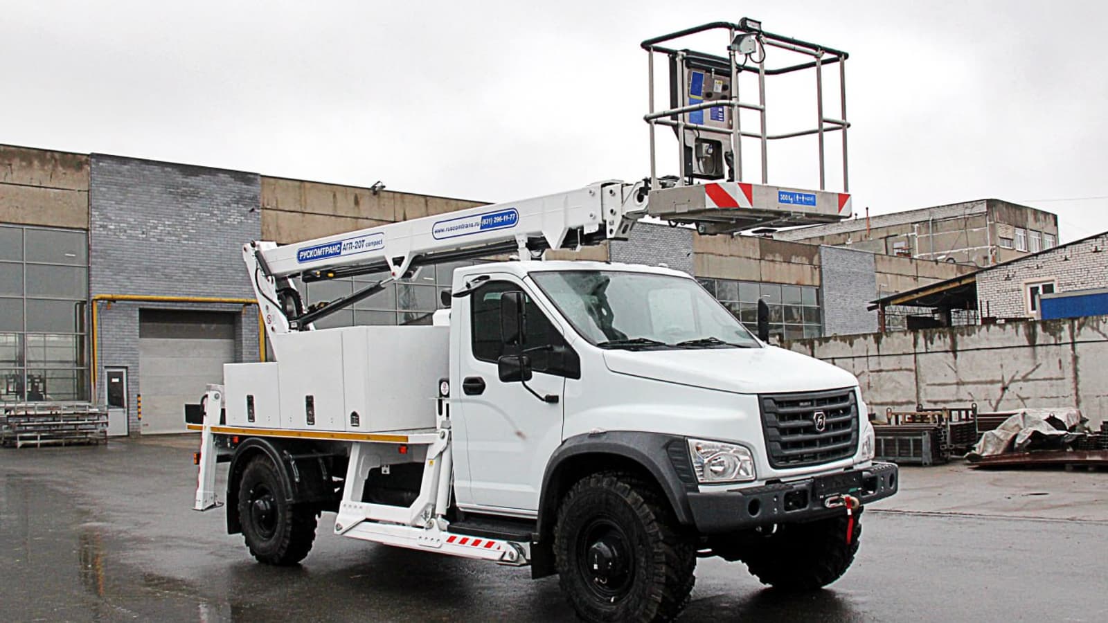 АГП-20Т серии compact на шасси автомобиля ГАЗ-С41А23 Садко NEXT с расположением люльки над кабиной предназначен перевозки и подъёма людей с инструментом для выполнения строительных и электромонтажных работ на высоте до 19,5 м. Отличительной особенностью такой конфигурации является сохранение стандартной колесной базы автомобиля и заднего свеса, что сохраняет компактность и проходимость автомобиля.